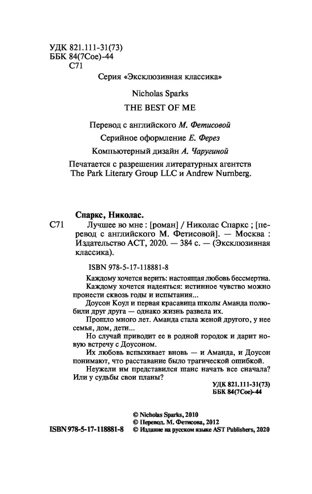 Лучшее во мнеВ данный момент этот товар отсутствует в продаже. Возможно, у нас найдется аналогичный или похожий товар здесь. Серия: Эксклюзивная классика Каждому хочется верить: настоящая любовь бессмертна. Каждому хочется надеяться: истинное чувство можно пронести сквозь годы и испытания... Доусон Коул и первая красавица школы Аманда полюбили друг друга, — однако жизнь развела их. Прошло много лет. Аманда стала женой другого, у нее семья, дом, дети... Но случай приводит ее в родной городок и дарит новую встречу с Доусоном. Их любовь вспыхивает вновь, — и Аманда, и Доусон понимают, что расставание было трагической ошибкой. Неужели, им представился шанс начать все сначала? Или у судьбы свои планы? |