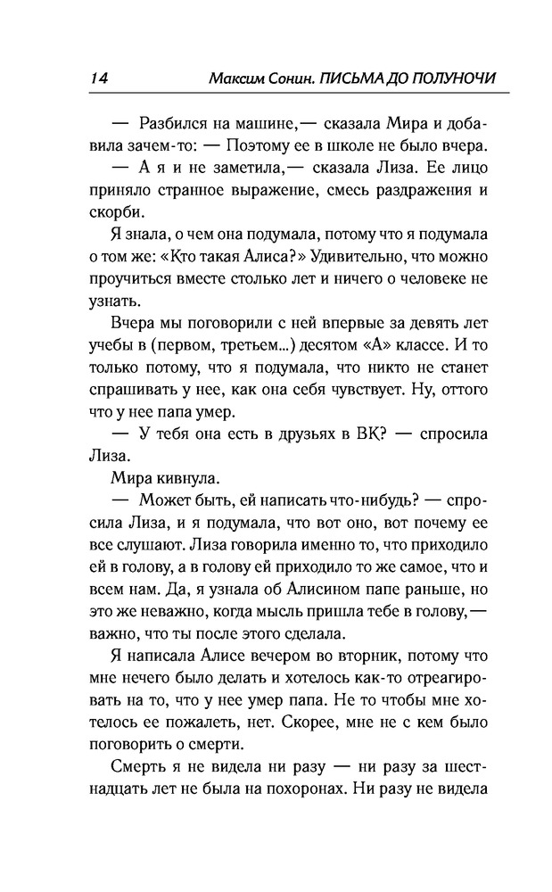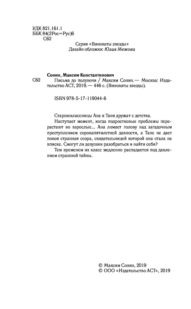 Письма до полуночиВ данный момент этот товар отсутствует в продаже. Возможно, у нас найдется аналогичный или похожий товар здесь. Серия: Виноваты звезды (КИНО!!) Старшеклассницы Ана и Таня дружат с детства. Наступает момент, когда подростковые проблемы перерастают во взрослые... Ана ломает голову над загадочным преступлением сорокапятилетней давности, а Тане не дает покоя странная ссора, свидетельницей которой она стала на вписке. Смогут ли девушки разобраться и найти себя? Тем временем их класс медленно распадается под давлением страшной тайны. |