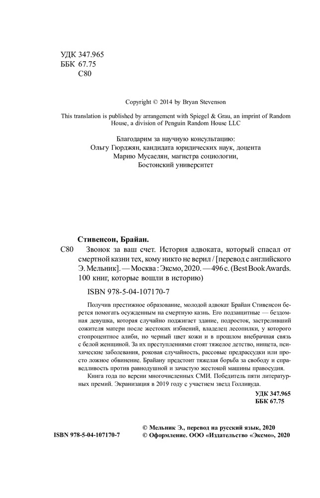 Звонок за ваш счет. История адвоката, который спасал от смертной казни тех, кому никто не верилВ данный момент этот товар отсутствует в продаже. Возможно, у нас найдется аналогичный или похожий товар здесь. Серия: Best Book Awards. 100 книг, которые вошли в историю Получив престижное образование, молодой адвокат Брайан Стивенсон берется помогать осужденным на смертную казнь. Его подзащитные — бездомная девушка, которая случайно поджигает здание. Подросток, застреливший сожителя матери после жестоких избиений. Владелец лесопилки, у которого стопроцентное алиби, но черный цвет кожи и в прошлом внебрачная связь с белой женщиной. За их преступлениями стоят тяжелое детство, нищета, психические заболевания, роковая случайность, расовые предрассудки или просто ложное обвинение. Брайону предстоит тяжелая борьба за свободу и справедливость против равнодушной и зачастую жестокой машины правосудия. Книга года по версии многочисленных СМИ. Победитель 5 литературных премий. Экранизация в 2019 году с участием звезд Голливуда. |