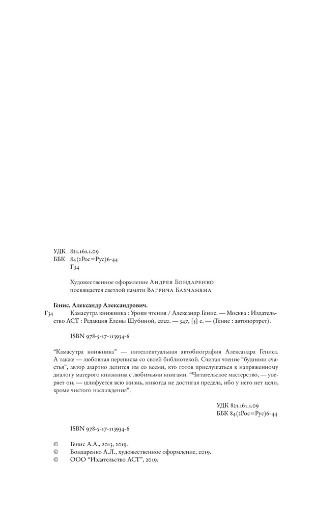 Камасутра книжникаВ данный момент этот товар отсутствует в продаже. Возможно, у нас найдется аналогичный или похожий товар здесь. Серия: Генис: автопортрет «Камасутра книжника» — интеллектуальная автобиография Александра Гениса. А также — любовная переписка со своей библиотекой. Считая чтение «буднями счастья», автор азартно делится им со всеми, кто готов прислушаться к напряженному диалогу матерого книжника с любимыми книгами. «Читательское мастерство, уверяет он, шлифуется всю жизнь, никогда не достигая предела, ибо у него нет цели, кроме чистого наслаждения». |