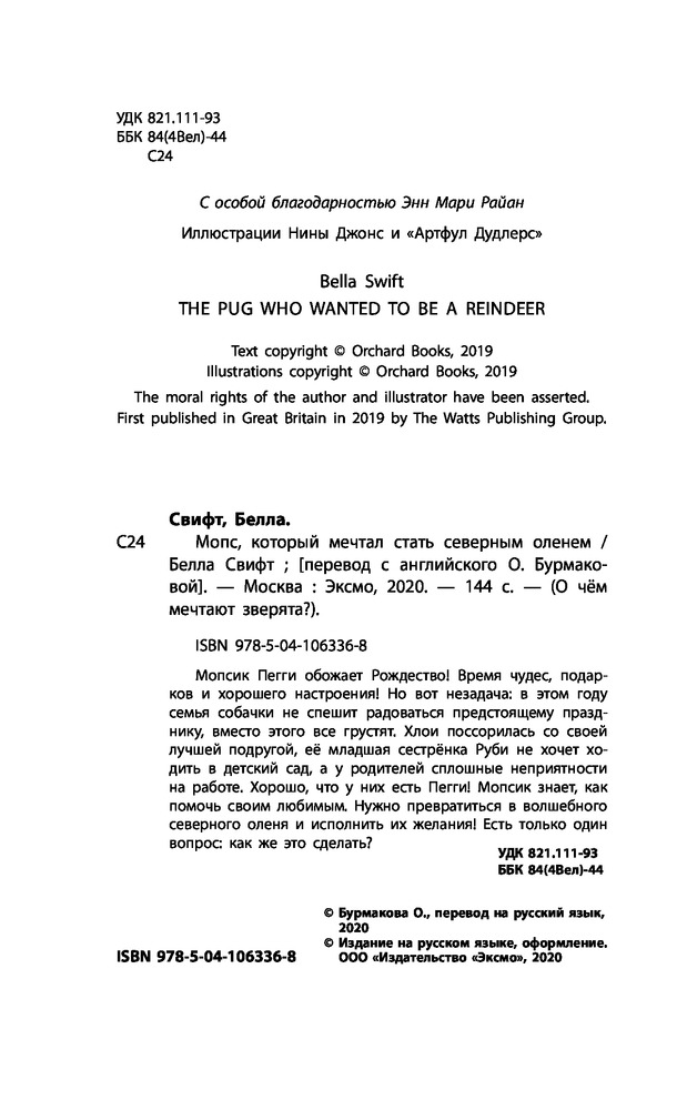 Мопс, который мечтал стать северным оленем (выпуск 3)В данный момент этот товар отсутствует в продаже. Возможно, у нас найдется аналогичный или похожий товар здесь. Серия: Детская. О чём мечтают зверята? Мопсик Пегги обожает Рождество! Время чудес, подарков и хорошего настроения! Но вот незадача: в этом году семья собачки не спешит радоваться предстоящему празднику, вместо этого все грустят. Хлои поссорилась со своей лучшей подругой, её младшая сестрёнка Руби не хочет ходить в детский сад, а у родителей сплошные неприятности на работе. Хорошо, что у них есть Пегги! Мопсик знает, как помочь своим любимым. Нужно превратиться в волшебного северного оленя и исполнить их желания! Есть только один вопрос: как же это сделать? |