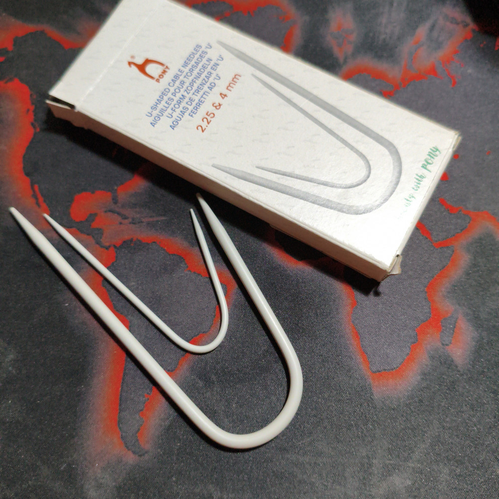 При вязании элементов шеи или рукава, или при работе над сложными косичками часто не достает третьей спицы, которая временно держала бы петли. Для такого случая есть набор с двумя вспомогательными спицами толщиной 2,25 мм длиной 7,5 см и 4 мм длиной 12 см. Эти иглы в классических серых тонах изготавливаются из прочного алюминия, и имеют идеально гладкую поверхность. Они будут оптимальными помощниками при вязании шарфов, шапок и свитеров с косичками и везде где необходимо наличие третий спицы.  |