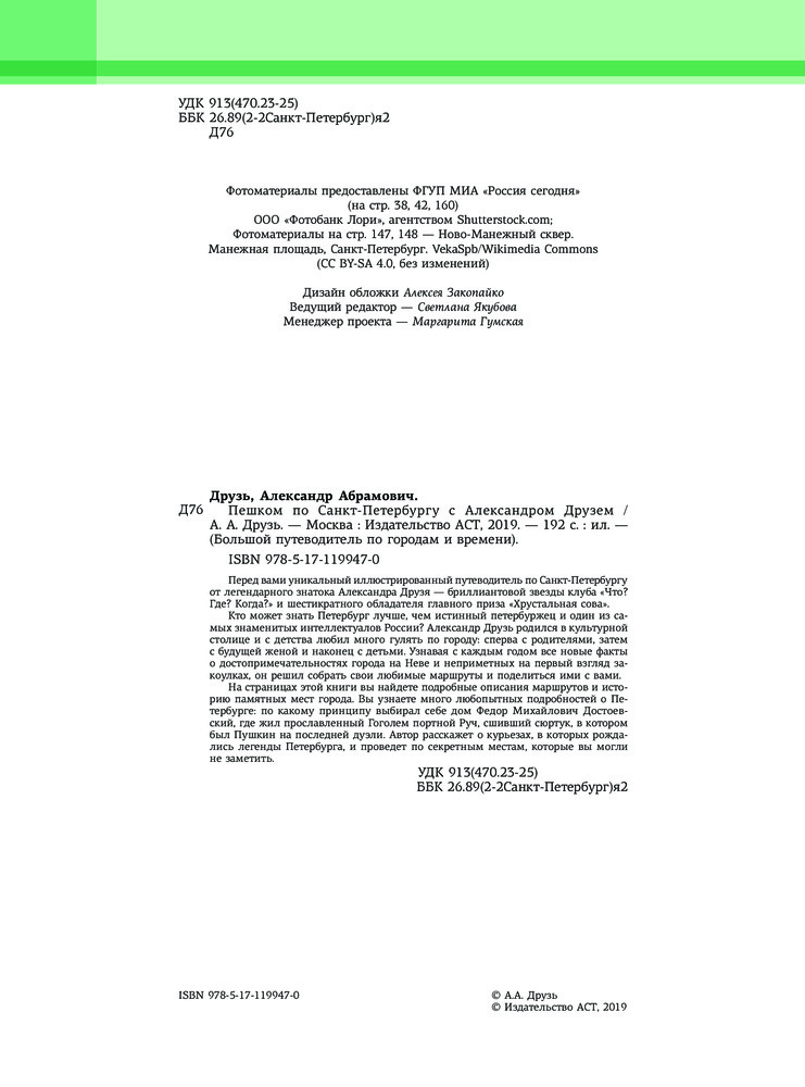 Пешком по Санкт-Петербургу с Александром ДруземВ данный момент этот товар отсутствует в продаже. Возможно, у нас найдется аналогичный или похожий товар здесь. Серия: Большой путеводитель по городам и времени Перед вами уникальный иллюстрированный путеводитель по Санкт-Петербургу от легендарного знатока Александра Друзя — бриллиантовой звезды клуба «Что? Где? Когда?» и шестикратного обладателя главного приза «Хрустальная сова». Кто может знать Петербург лучше, чем истинный петербуржец и один из самых знаменитых интеллектуалов России? Александр Друзь родился в культурной столице и с детства любил много гулять по городу: сперва с родителями, затем с будущей женой и наконец с детьми. Узнавая с каждым годом все новые факты о достопримечательностях города на Неве и неприметных на первый взгляд закоулках, он решил собрать свои любимые маршруты и поделиться ими с вами. На страницах этой книги вы найдете подробные описания маршрутов и историю памятных мест города. Вы узнаете много любопытных подробностей о Петербурге: по какому принципу выбирал себе дом Федор Михайлович Достоевский, где жил прославленный Гоголем портной Руч, сшивший сюртук, в котором был Пушкин на последней дуэли. Автор расскажет о курьезах, в которых рождались легенды Петербурга, и проведет по секретным местам, которые вы могли не заметить. |