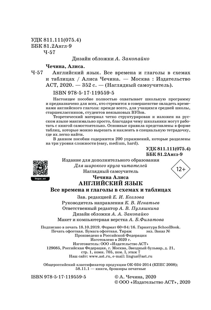 Английский язык. Все времена и глаголы в схемах и таблицахВ данный момент этот товар отсутствует в продаже. Возможно, у нас найдется аналогичный или похожий товар здесь. Серия: Наглядный самоучитель Настоящее пособие полностью охватывает школьную программу и предназначено для всех, кто стремится в совершенстве овладеть временами английского глагола: прежде всего, для учащихся средней школы, старшеклассников, студентов неязыковых ВУЗов. |