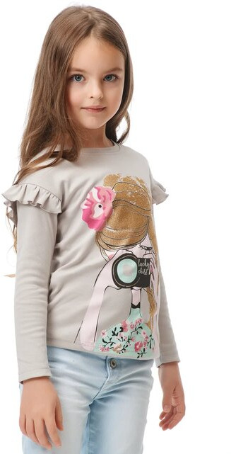 Легкий, стильный лонгослив нейтральной расцветки с крутым принтом не оставит не одну девочку равнодушной. Модная модель хорошо подходит по размеру для детей разной комплекции. Не линяет, не вытягивается, все идеально.