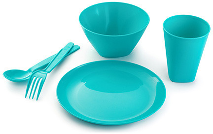 Хороший крепкий пластик. Посуда не пахнет. Цвет насыщенный. У вилки хлипкие зубцы, а ложка достаточно крепкая. В целом набор понравился.