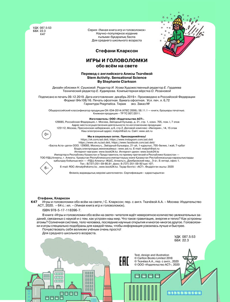Игры и головоломки обо всем на светеВ данный момент этот товар отсутствует в продаже. Возможно, у нас найдется аналогичный или похожий товар здесь. Серия: Умная книга игр и головоломок В книге «Игры и головоломки обо всём на свете» читателя ждёт невероятное количество увлекательных заданий, связанных с наукой и с тем, как устроен наш мир. Что такое гравитация, энергия и тепло? Как устроены атомы? Солнечная система, тело человека, последние научные открытия и многое-много другое. Головоломки и игры специально подобраны для каждой новой темы, чтобы информация усвоилась лучше и быстрее. Почувствовать себя великим учёным очень просто! Для среднего школьного возраста. |