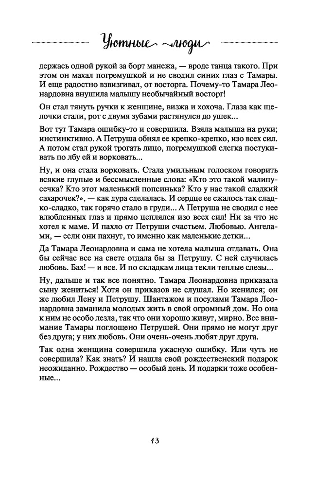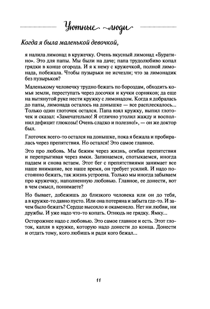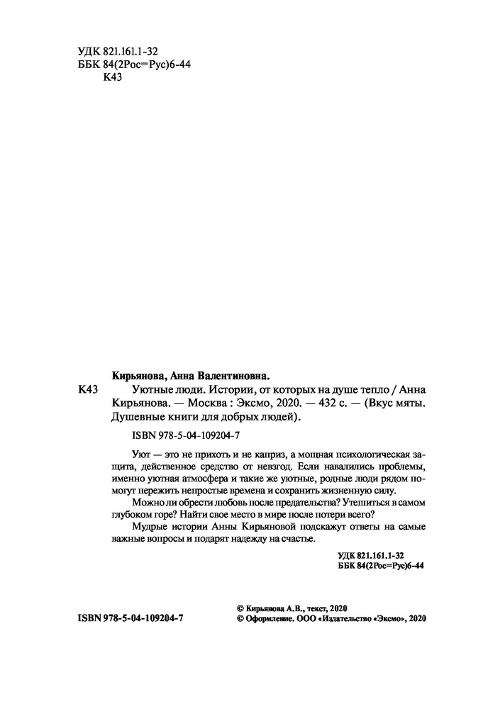 Уютные люди. Истории, от которых на душе теплодушевные истории короткие истории лёгкий стиль жизненные сюжеты В данный момент этот товар отсутствует в продаже. Возможно, у нас найдется аналогичный или похожий товар здесь. Серия: Вкус мяты. Душевные книги для добрых людей Уют — это не прихоть и не каприз, а мощная психологическая защита, действенное средство от невзгод. Если навалились проблемы, именно уютная атмосфера и такие же уютные, родные люди рядом помогут пережить непростые времена и сохранить жизненную силу. Можно ли обрести любовь после предательства? Утешиться в самом глубоком горе? Найти свое место в мире после потери всего? Мудрые истории Анны Кирьяновой подскажут ответы на самые важные вопросы и подарят надежду на счастье. |