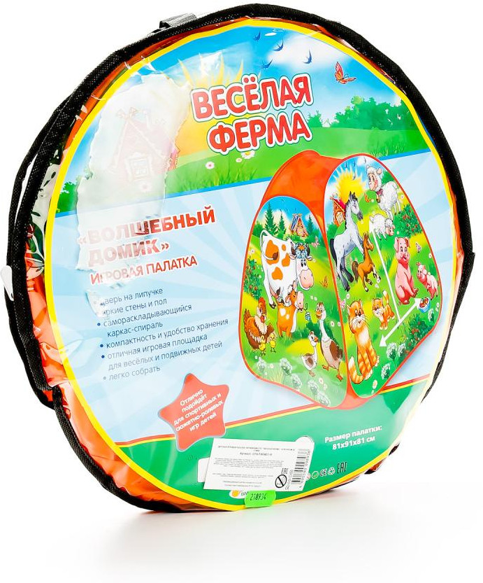 Играем вместе Палатка игровая «Веселая ферма»В данный момент этот товар отсутствует в продаже. Возможно, у нас найдется аналогичный или похожий товар здесь. Серия: Веселая ферма Детская игровая палатка от компании «Играем Вместе» изготовлена из прочного, безопасного, высококачественного текстиля, который можно стирать. Палатка легко устанавливается, а после игры просто складывается. Каркас палатки позволяет изделию держать форму. Сетчатые вставки позволяют воздуху свободно циркулировать в домике и защищают от насекомых. Детская игровая палатка украшена изображениями животных, которые живут на ферме. Палатка упакована в удобную для транспортировки сумку. |