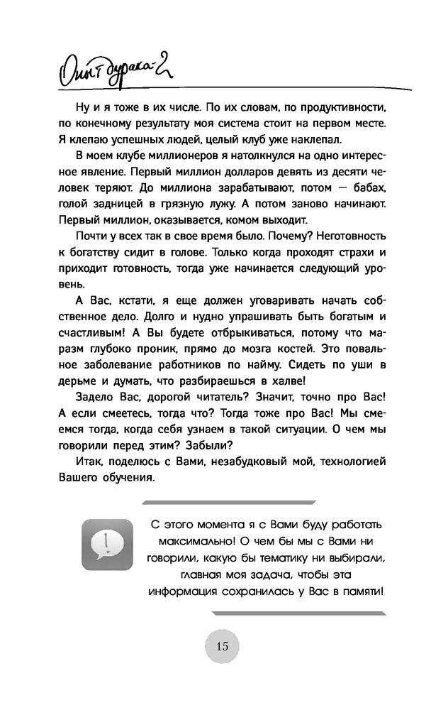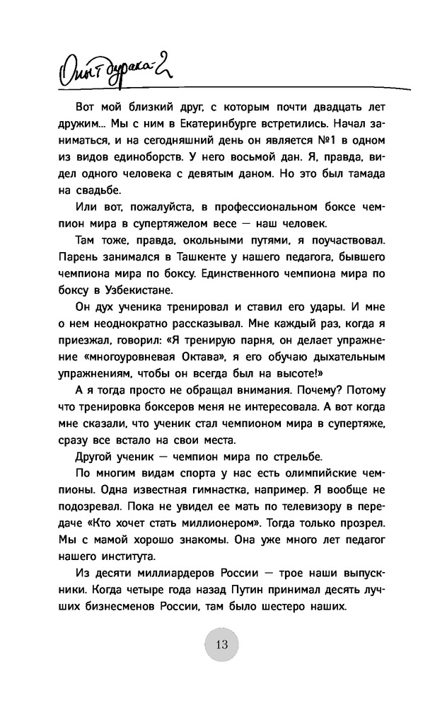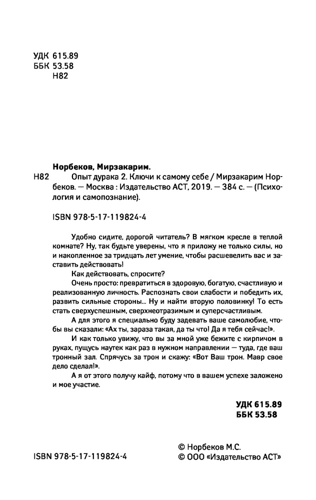 Опыт дурака 2. Ключи к самому себеМирзакарим Санакулович Норбеков В данный момент этот товар отсутствует в продаже. Возможно, у нас найдется аналогичный или похожий товар здесь. Серия: Психология и самопознание Удобно сидите, дорогой читатель? В мягком кресле в теплой комнате? Ну, так будьте уверены, что я приложу не только силы, но и накопленное за тридцать лет умение, чтобы расшевелить вас и заставить действовать! |