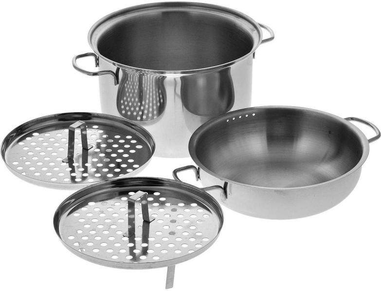 АМЕТ Кастрюля-мантоваркаВ данный момент этот товар отсутствует в продаже. Возможно, у нас найдется аналогичный или похожий товар здесь. Мантышница для приготовления диетических блюд на пару, в частности — мантов. Изделие изготовлено из нержавеющей стали с трехслойным теплораспределительным дном из алюминия и защитной пластиной из нержавеющей стали. Дно с теплораспределительным слоем защищает пищу от перегрева и подгорания. Изделие гигиенично и безопасно для здоровья. Нержавеющая сталь обладает малой теплопроводностью, поэтому посуда из нее остывает гораздо медленнее, чем любой другой вид посуды, а значит, приготовленное в ней более длительное время остается горячим. Мантоварка укомплектована двумя решетками из нержавеющей стали на ножках и крышкой. Крышка плотно прилегает к краю мантоварки, сохраняя аромат блюд. Крышка оснащена двумя удобными ручками и отверстиями для выпуска пара. |