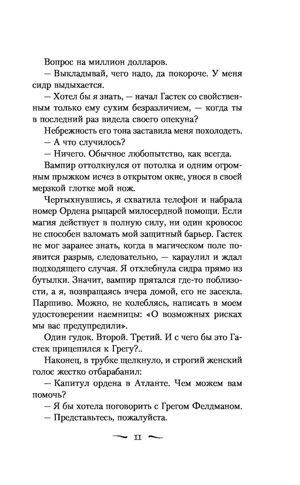 Наемница и свободный стрелок, Кейт Дэниелс живет в мире, полном коварных существ и превращений. В городе, где с неба сыплются крылатые змеи, а прилив магии рушит небоскребы. Когда опекуна Кейт — рыцаря-прорицателя Грега Фелдмана — находят убитым, кажется, Атланта катится в преисподнюю... Возвращаться под защиту Ордена накануне 25-летия Кейт не хочет — спасибо ослиному упрямству и острому языку. Зато берется расследовать гибель прорицателя. Встречает союзников среди спятивших магов, сбрендивших оборотней и мошенников-некромантов. А заодно — красавца-мужчину с золотыми искорками в глазах...