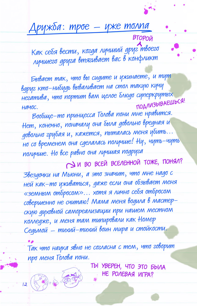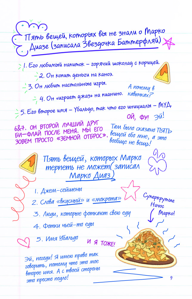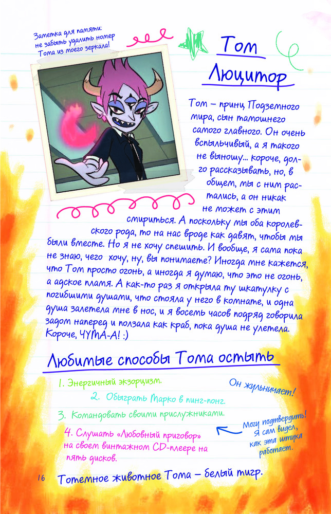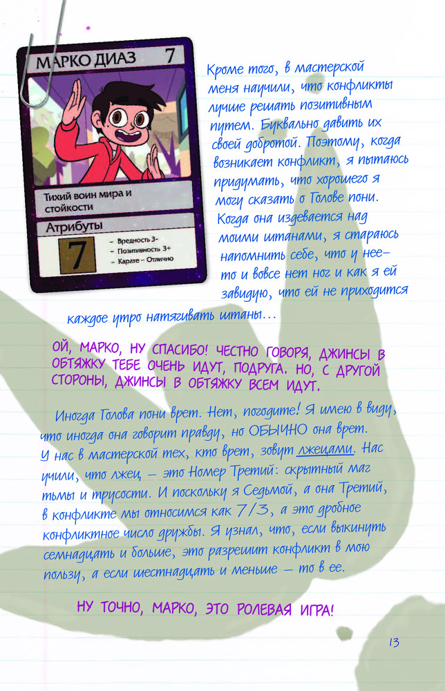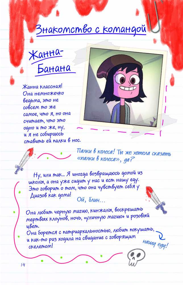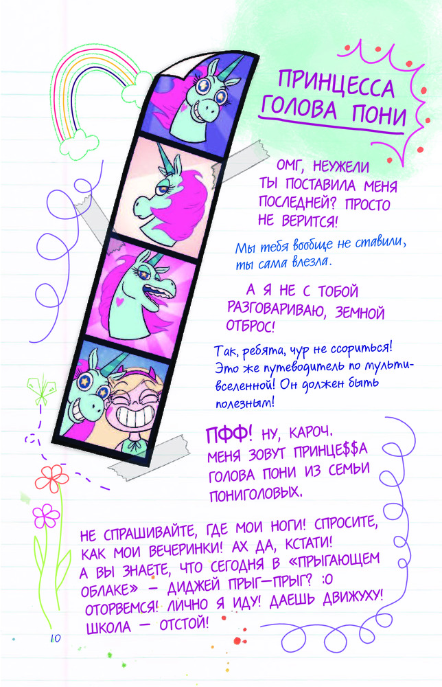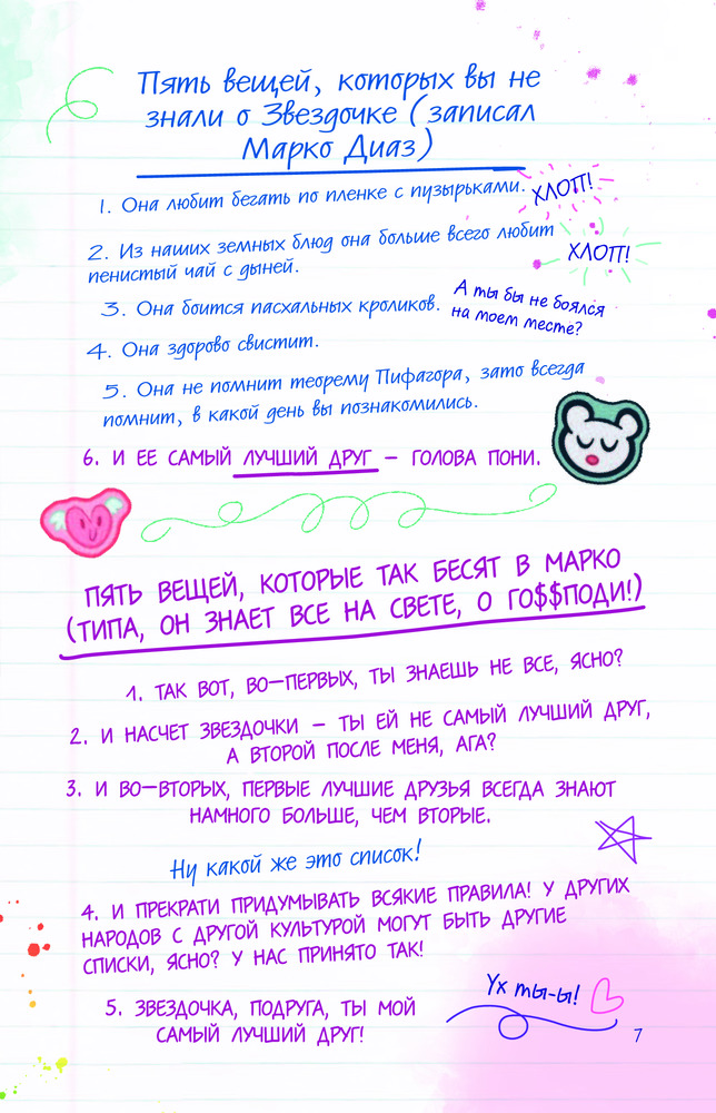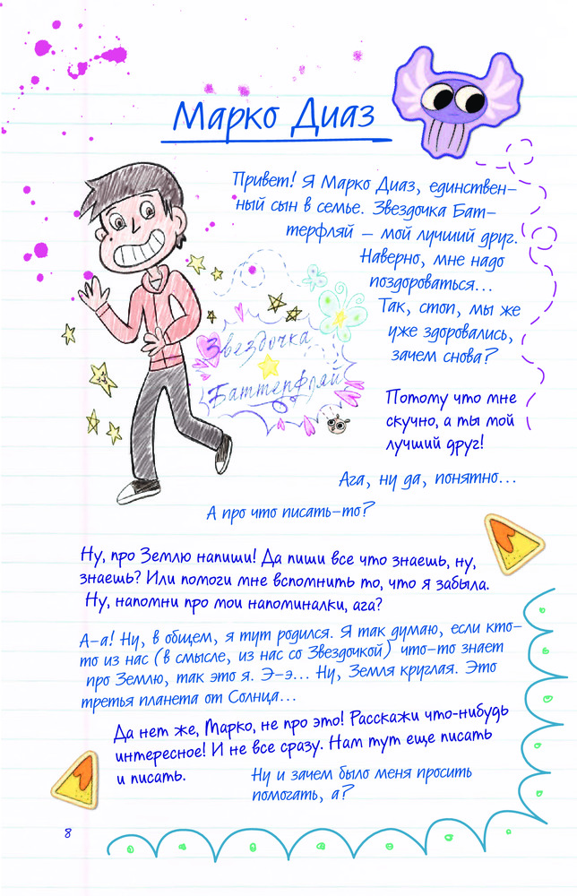 «Путеводитель Звездочки и Марко по всем измерениям» — это путеводитель по вселенной популярного анимационного сериала «Звездная принцесса и силы зла», который идет на телеканале Disney. Эта книга понравится не только поклонникам мультфильма, но и фанатам «Гравити Фолз». Столько же юмора, приколов, необычайных происшествий и мегакрутых персонажей! Звездочка Баттерфляй — принцесса с далекой планеты Мьюни, которую родители отправляют на Землю. Звездочка останавливается в доме у семейства Диазов, где и знакомится с Марко. Все бы ничего, и они даже становятся лучшими друзьями, вот только Звездочка привыкла жить по законам и традициям своего мира. А это значит, что ей ничего не стоит при помощи волшебной палочки устроить из дома Диазов аквапарк, наколдовать щеночков, стреляющих лазерными лучами и превратить школьную учительницу в тролля. Короче говоря, Марко ждут еще те приключения! |