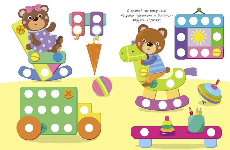 Серия: Многоразовые развивающие наклейки. Винтики Уважаемые взрослые! В этой книге 198 наклеек — разноцветных винтиков и болтиков! Малыш должен дополнить с их помощью картинки. Это очень просто: покажите ему, что наклейку нужно приклеить на белый кружочек. Обратите внимание малыша на то, что в первую очередь нужно приклеить детали, которые скрепляют элементы конструкций между собой. Если с первой попытки приклеить ровно не получилось — не беда, ведь наши наклейки многоразовые. |