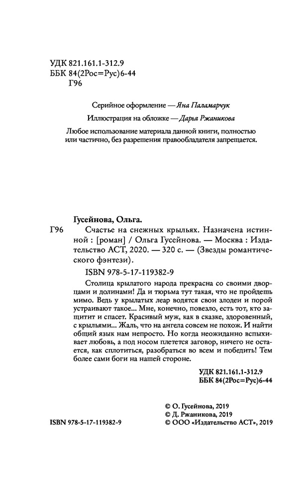 Счастье на снежных крыльях. Назначена истиннойВ данный момент этот товар отсутствует в продаже. Возможно, у нас найдется аналогичный или похожий товар здесь. Серия: Звезды романтического фэнтези Столица крылатого народа прекрасна со своими дворцами и долинами! Да и тюрьма тут такая, что не пройдешь мимо. Ведь у крылатых леар водятся свои злодеи и порой устраивают такое... Мне, конечно, повезло, есть тот, кто защитит и спасет. Красивый муж, как в сказке, здоровенный, с крыльями... Жаль, что на ангела совсем не похож. И найти общий язык нам непросто. Но когда неожиданно вспыхивает любовь, а под носом плетется заговор, ничего не остается, как сплотиться, разобраться во всем и победить! Тем более сами боги на нашей стороне. |