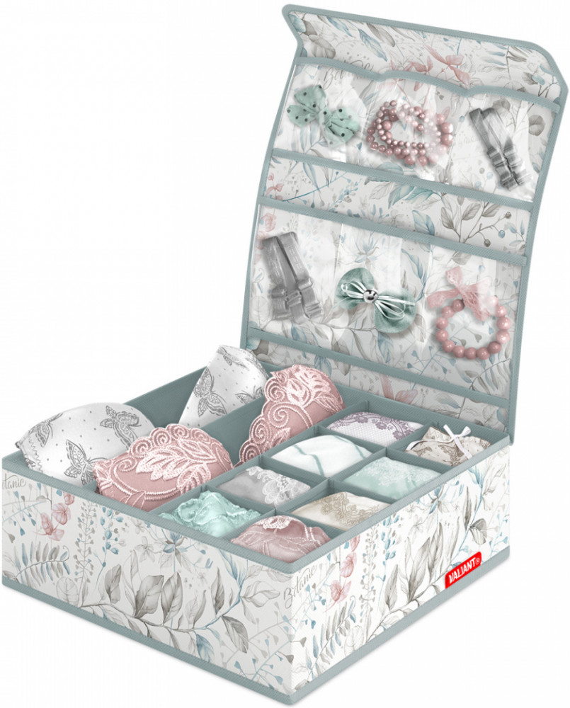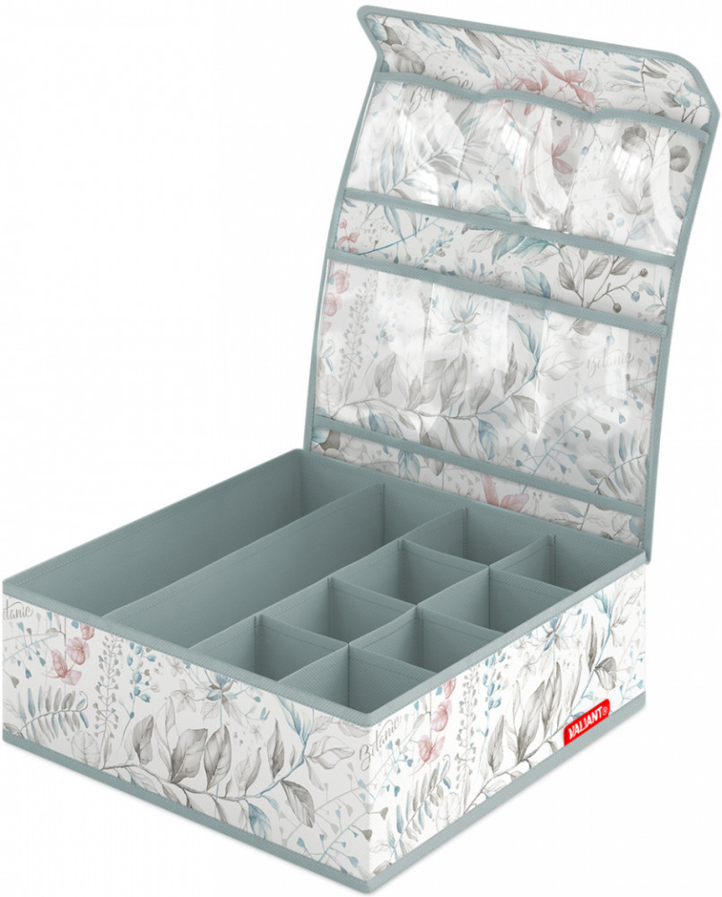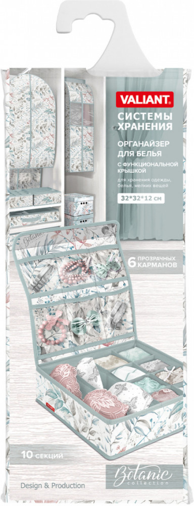 Valiant Органайзер для белья с функциональной крышкойВ данный момент этот товар отсутствует в продаже. Возможно, у нас найдется аналогичный или похожий товар здесь. Серия: Botanic Универсальный органайзер с функциональной мягкой крышкой поможет упорядочить размещение нижнего белья. Cистема хранения «Botanic Collection» в скандинавском стиле гармонично смотрится в современном гардеробе. Мягкие перегородки образуют 10 секций для хранения и позволяют вещам удобно разместиться внутри органайзера. |