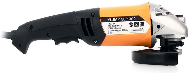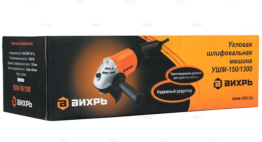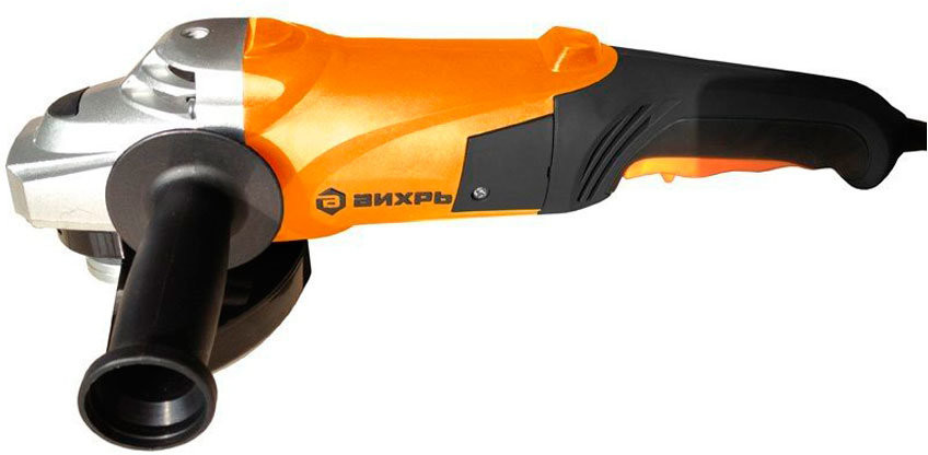 Машина угловая шлифовальная «Вихрь 150/1300» — оснащена двигателем мощностью 1300 Вт. Для быстрой и легкой смены дисков предусмотрена блокировка шпинделя. Боковая рукоятка позволяет лучше контролировать инструмент во время работы. Диаметр диска составляет 150 мм. Болгарка на 150 мм является прекрасной альтернативой купить небольшую и немаленькую болгарку. Поэтому, кто не может решиться, что лучше — 125 или 180 мм, тот может выбрать размер 150. Такой болгаркой удобно и шлифовать, и резать. Отличается простотой в эксплуатации и прочным корпусом.