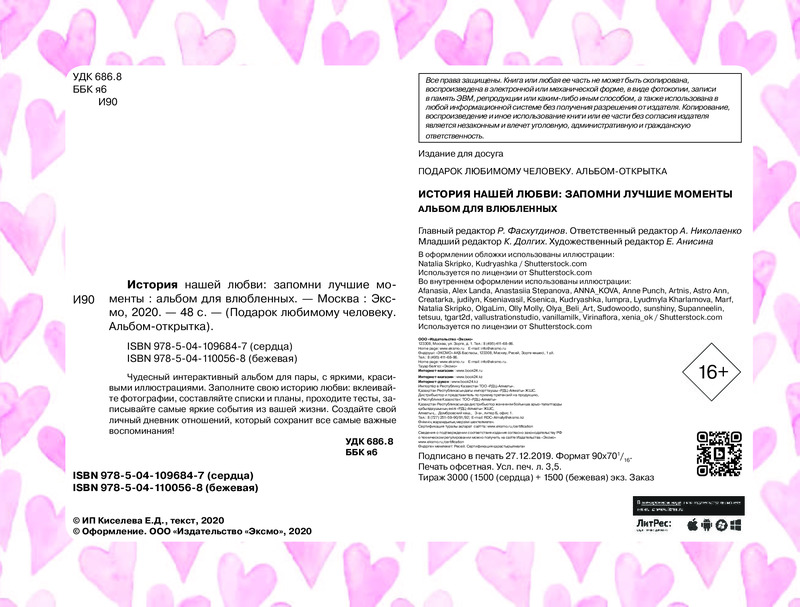 История нашей любви. Запомни лучшие моменты. Альбом для влюбленныхВ данный момент этот товар отсутствует в продаже. Возможно, у нас найдется аналогичный или похожий товар здесь. Серия: Подарок любимому человеку. Альбом-открытка Чудесный интерактивный альбом для пары, с яркими, красивыми иллюстрациями. Заполните свою историю любви: вклеивайте фотографии, составляйте списки и планы, проходите тесты, записывайте самые яркие события из вашей жизни. Создайте свой личный дневник отношений, который сохранит все самые важные воспоминания! |
