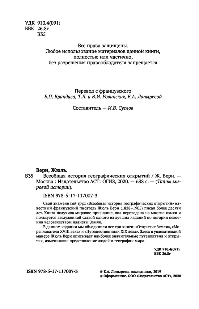 Серия: Тайны мировой истории Свой знаменитый труд «Всеобщая история географических открытий» известный французский писатель Жюль Верн (1828–1905) писал более десяти лет. Книга получила мировое признание, она переведена на многие языки и пользуется заслуженной славой одного из лучших изданий по истории освоения человечеством планеты Земля. В данном издании мы объединили все три книги: «Открытие Земли», «Мореплаватели XVIII века» и «Путешественники XIX века». Здесь в увлекательной манере Жюль Верн описывает наиболее значительные путешествия и открытия, изменившие представление людей о географии мира. |