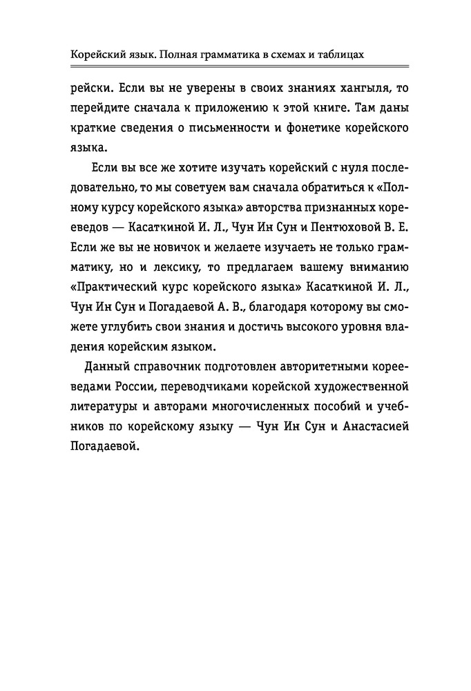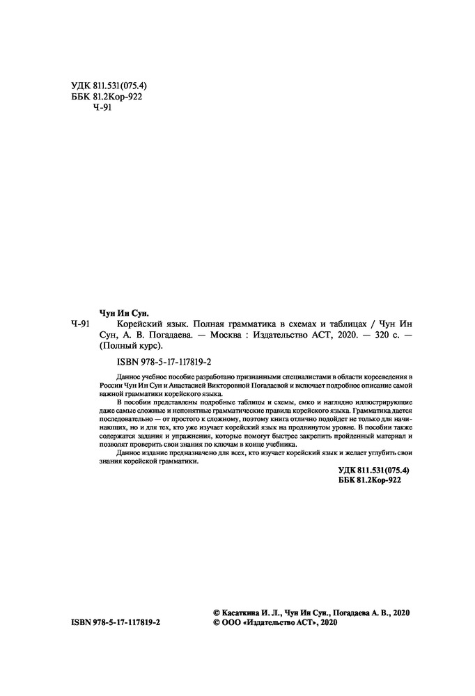 Корейский язык. Полная грамматика в схемах и таблицахАнастасия Викторовна Погадаева, Чун Ин Сун В данный момент этот товар отсутствует в продаже. Возможно, у нас найдется аналогичный или похожий товар здесь. Серия: Полный курс Данное учебное пособие разработано признанными специалистами в области корееведения в России Чун Ин Сун и Анастасией Викторовной Погадаевой и включает подробное описание самой важной грамматики корейского языка. В пособии представлены подробные таблицы и схемы, емко и наглядно иллюстрирующие даже самые сложные и непонятные грамматические правила корейского языка. Грамматика дается последовательно — от простого к сложному, поэтому книга отлично подойдет не только для начинающих, но и для тех, кто уже изучает корейский язык на продвинутом уровне. В пособии также содержатся задания и упражнения, которые помогут быстрее закрепить пройденный материал и позволят проверить свои знания по ключам в конце учебника. Данное издание предназначено для всех, кто изучает корейский язык и желает углубить свои знания корейской грамматики.  |