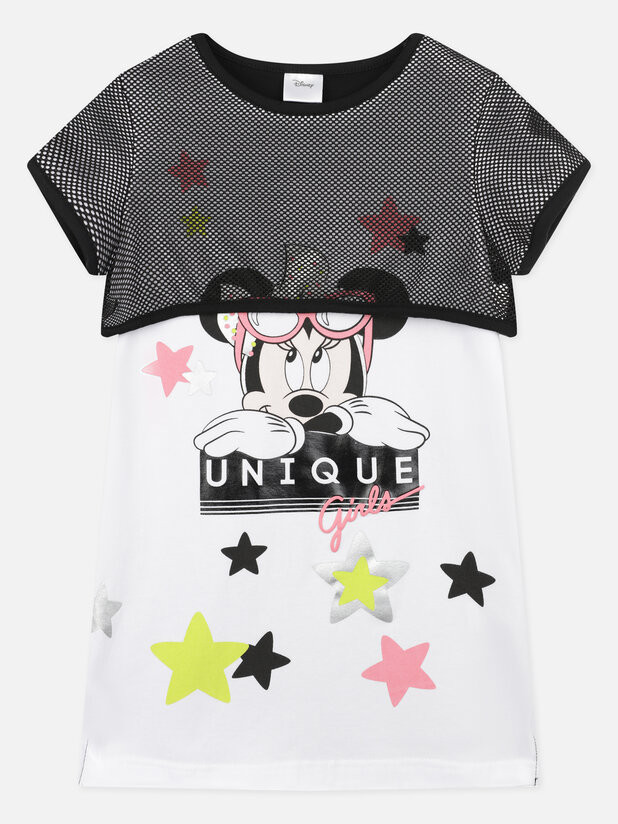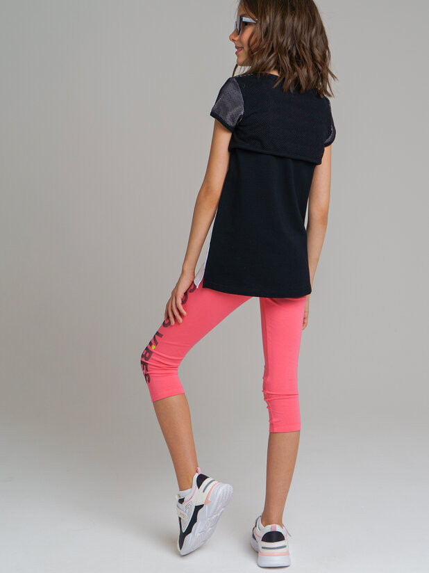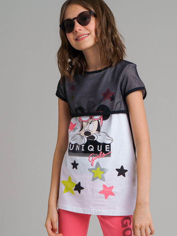 Футболка из качественного и приятного на ощупь трикотажа. Благодаря наличию эластана в составе ткани изделие проще в уходе и держит форму. Сверху пришитое болеро из крупной сетки. Принт с акцентными блестящими деталями foil.
