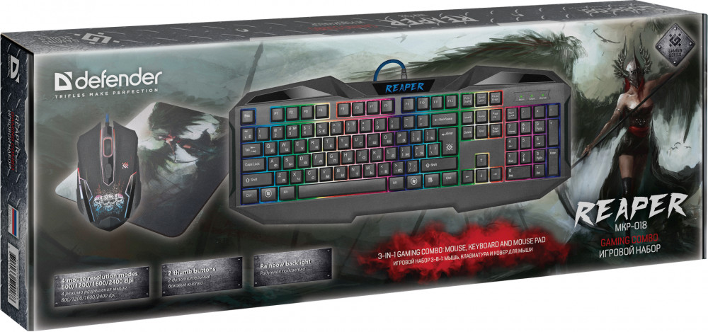 Defender Набор игровой Defender Reaper MKP-018 RUВ данный момент этот товар отсутствует в продаже. Возможно, у нас найдется аналогичный или похожий товар здесь. Игровой набор Defender Reaper MKP-018 RU (клавиатура, мышь, коврик) оптимально подходит к стационарным компьютерам в качестве комплекта внешних устройств для работы и развлечений. Стандартно расположенные кнопки клавиатуры имеют мембранную конструкцию, поэтому нажатие происходит мягко и практически бесшумно. Созданию комфортных условий для эксплуатации в темное время суток способствует встроенная подсветка. Модель подключается к системному блоку при помощи разъема распространенного стандарта USB. |