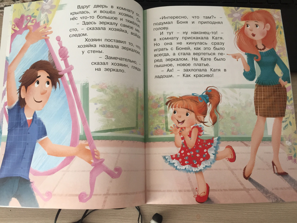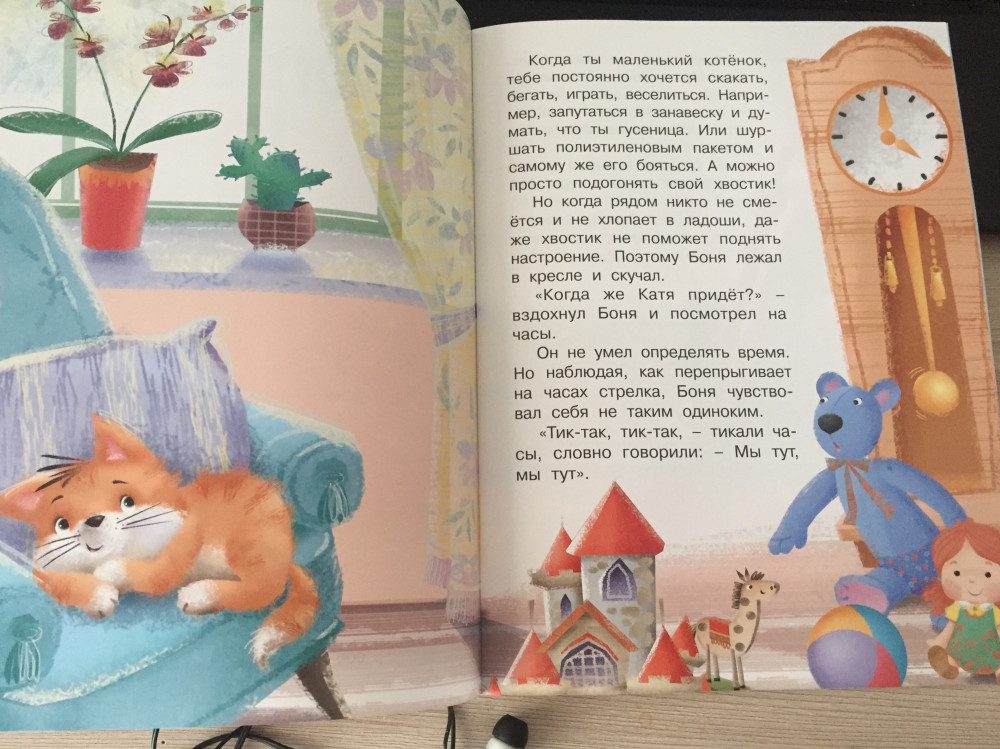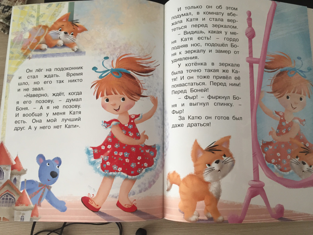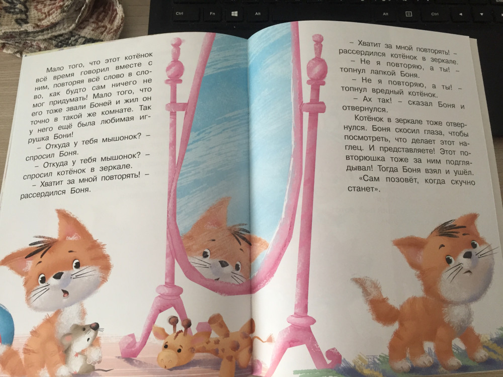 Рекомендую приобрести серию книг про котёнка Боню! У нас 4 книги. Формат книг большой, А4, обложка мягкий картон средней плотности. Листы глянец, средней плотности. Рассказ про то, как в комнате появилось зеркало и котёнок в нем увидел такого же котёнка, как он сам. Но конечно же, глупыш, не мог этого знать. И Боня думал, что котёнок в зеркале его дразнит. Очень смешной и интересный рассказ! Не наскучит точно!