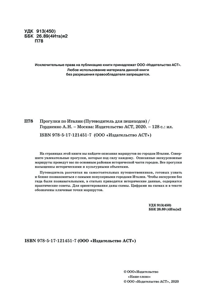 Серия: Путеводители для пешеходов На страницах этой книги вы найдете описания маршрутов по городам Италии — Рим, Флоренция, Неаполь, Венеция, Милан. Совершите увлекательные прогулки, которые под силу каждому. Описанные экскурсионные маршруты проведут вас по основным районам исторической части городов. Все прогулки насыщенны историческими и культурными объектами. Путеводитель рассчитан на самостоятельных путешественников, готовых узнать и ближе познакомиться с самыми популярными городами Италии. Чтобы экскурсии без гида были познавательными, в статьях приводятся исторические данные, содержатся практические советы. Для ориентирования даны схемы. Цифрами на схемах и в тексте обозначены ключевые точки маршрутов.  |