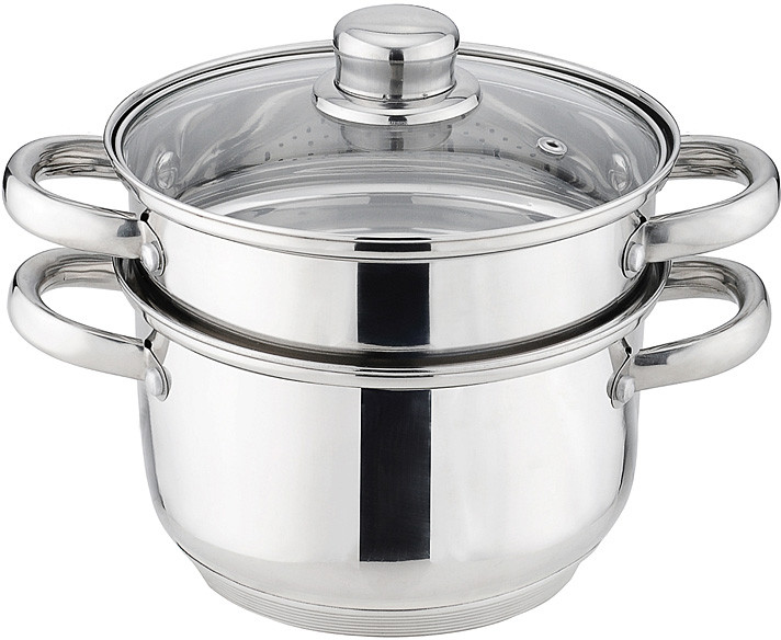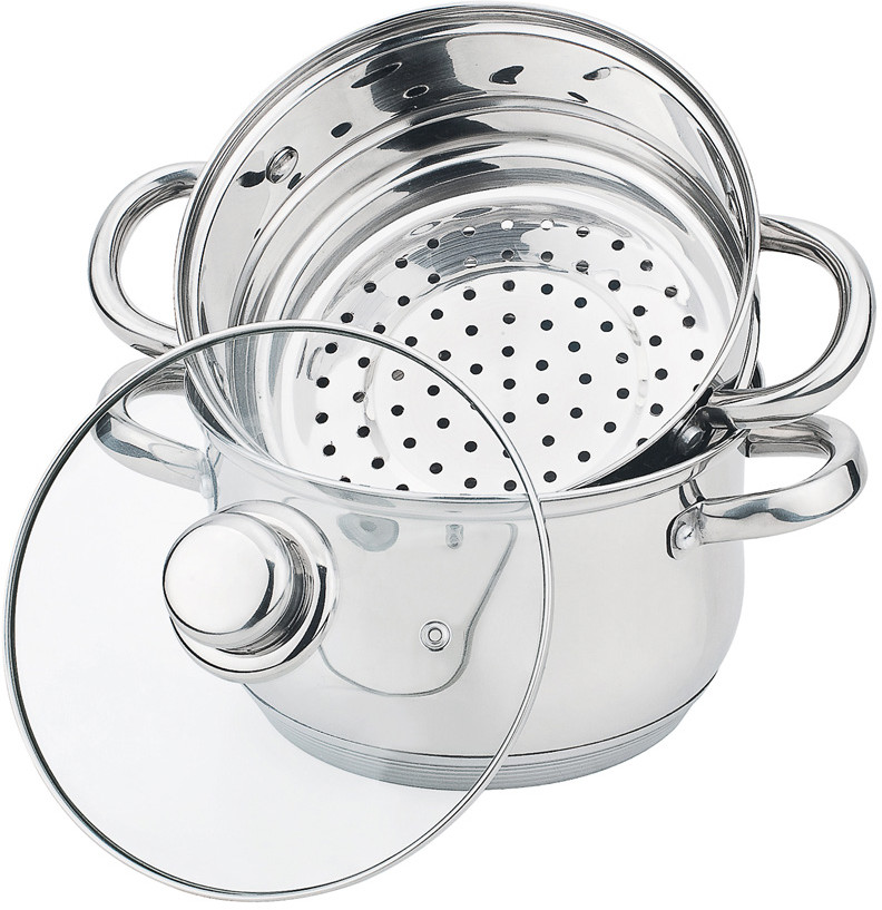 Кастрюля со вставкой - пароваркой со стеклянной крышкой изготовлена из нержавеющей стали, последние несколько лет посуда из нержавеющей стали стала настоящим хитом на рынке кухонной посуды, и не случайно, она имеет особый состав, что придает посуде особую прочность и устойчивость к коррозии, износу. Горячий пар овевает пищу со всех сторон, и она готовится быстрее и равномернее обычного.