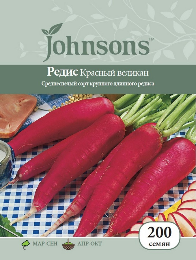 Johnsons Редис «Красный великан»В данный момент этот товар отсутствует в продаже. Возможно, у нас найдется аналогичный или похожий товар здесь. Растение относится к среднеспелым сортам редиса. Срок вегетации составляет до 30 дней. Корнеплоды удлиненно-цилиндрической формы, длина — около 12-13 см. Средний вес одного плода — 100 г. Сорт устойчив к цветушности, достаточно хорошо переносит холод. Вкусовые характеристики прекрасны — корнеплоды сочные, с хрустящей белой мякотью, имеется легкая острота. |