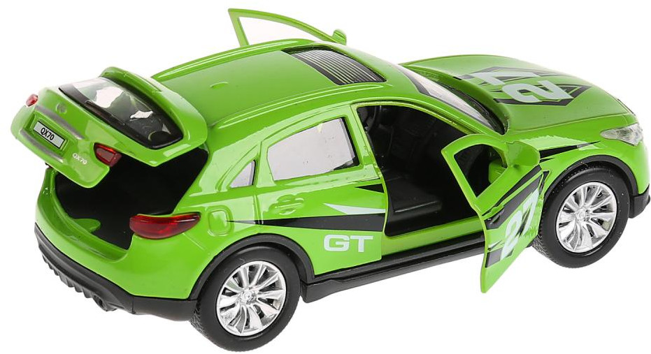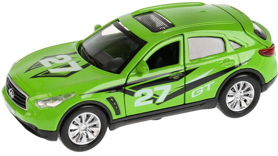 Металлической машине, выполненной уменьшенной реалистичной копией спортивного автомобиля Infiniti Qx70 не страшны столкновения во время гонки на игровой трассе. У нее прочный корпус, окрашенный в зеленый цвет со стильным рисунком. Машинка способна ускоряться благодаря инерционному механизму движения. |