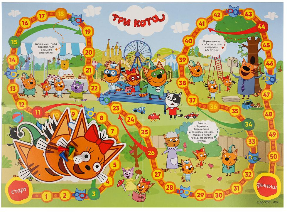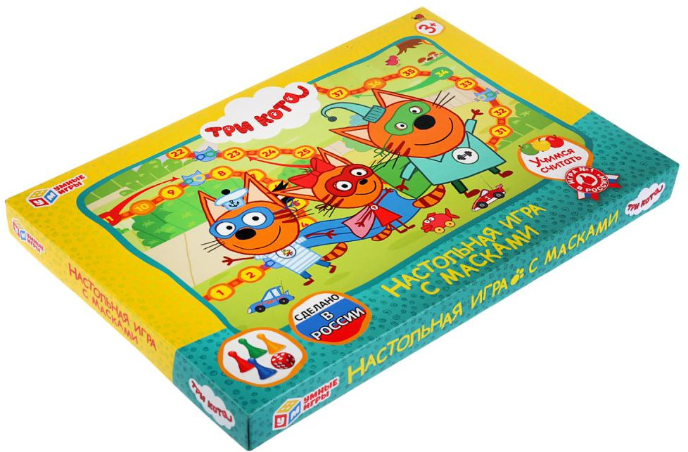 Настольная игра-ходилка от ТМ «Умные Игры» — «Три кота, с масками». Игровое поле имеет прямоугольную форму и красочное оформление с героями детского мультсериала «Три кота». Одновременно участвовать в игре могут 2-4 человека, для каждого из них будет отведена фишка определенного цвета и соответствующая маска. Количество ходов определяется выпавшим на кубике числом точек. Суть игры состоит в том, чтобы быстрее остальных добраться до финиша. |