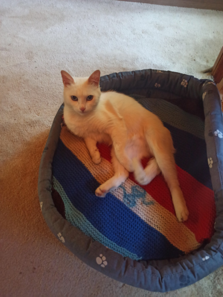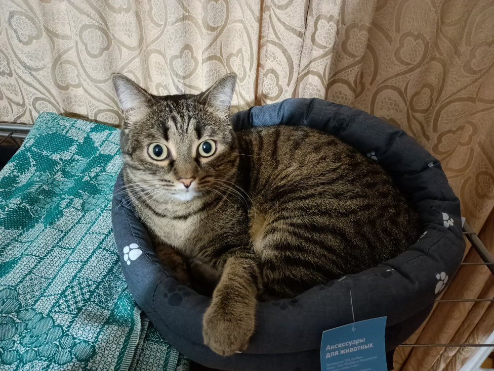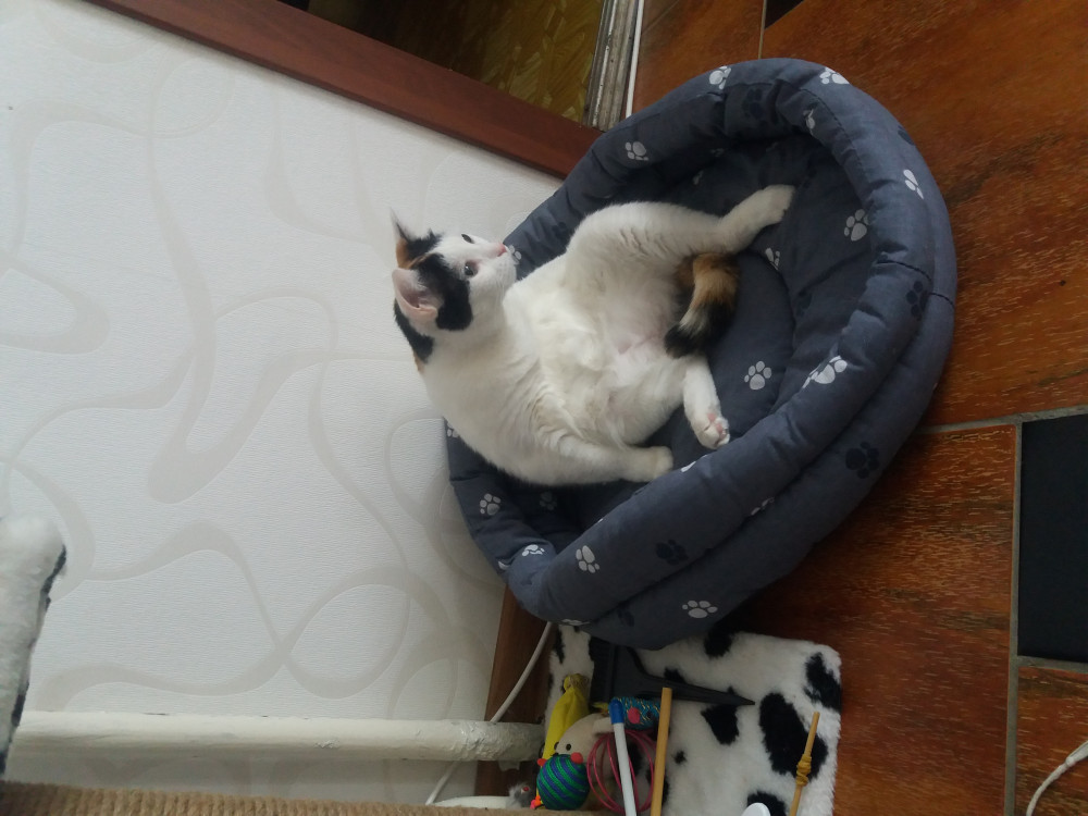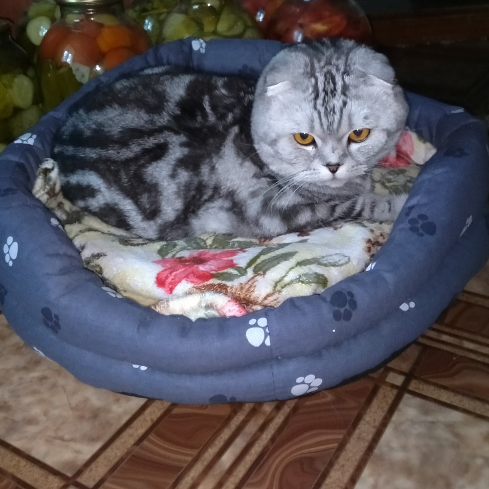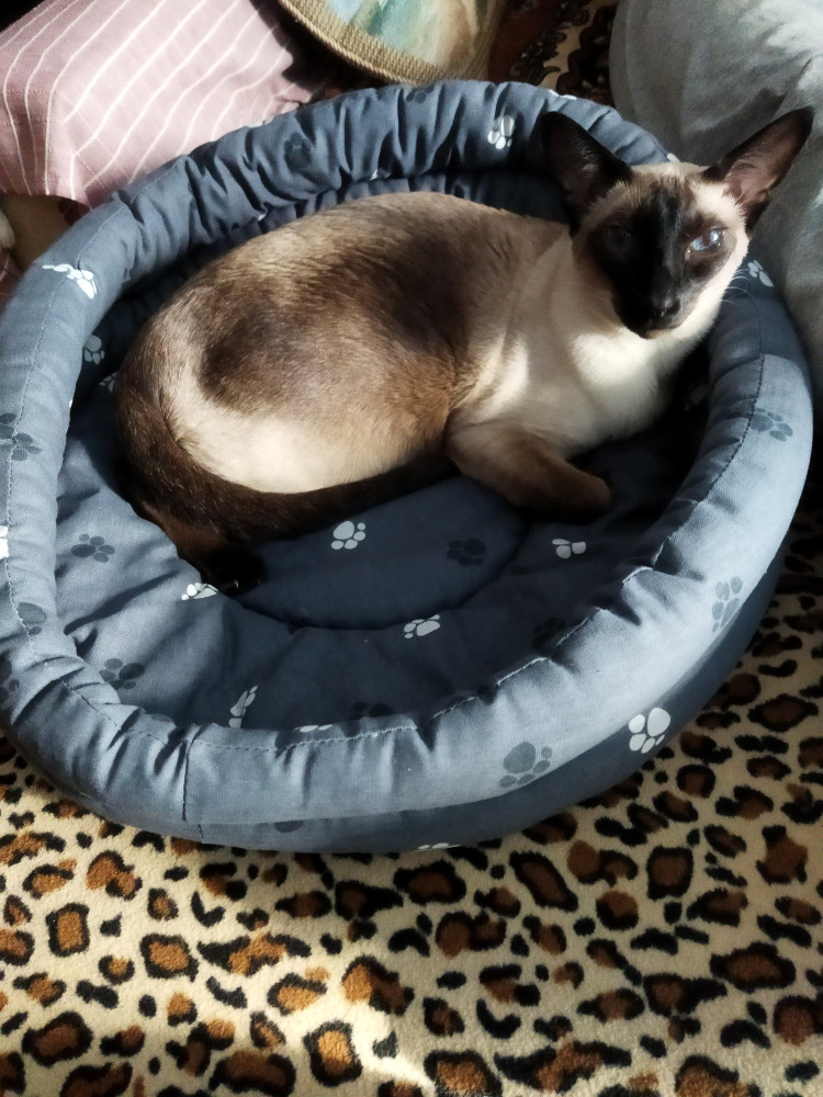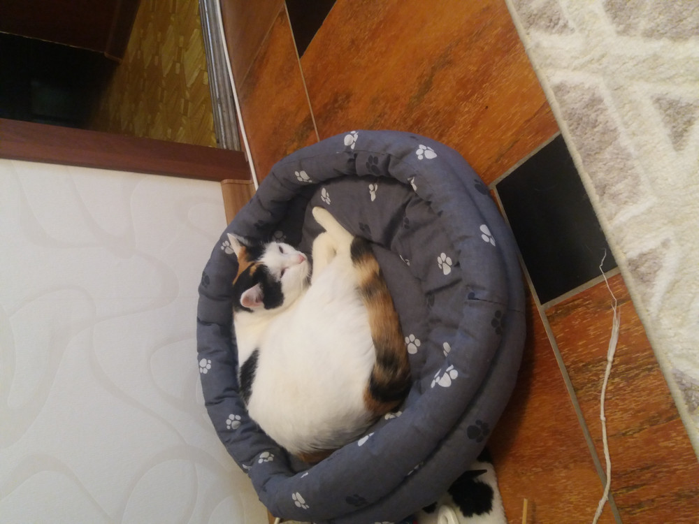 Кошка отказалась в нём лежать, несмотря на то,о что я туда насыпала кошачьей мяты) и предпочла кухонные стулья. Лежак подарили хозяевам маленького котёнка