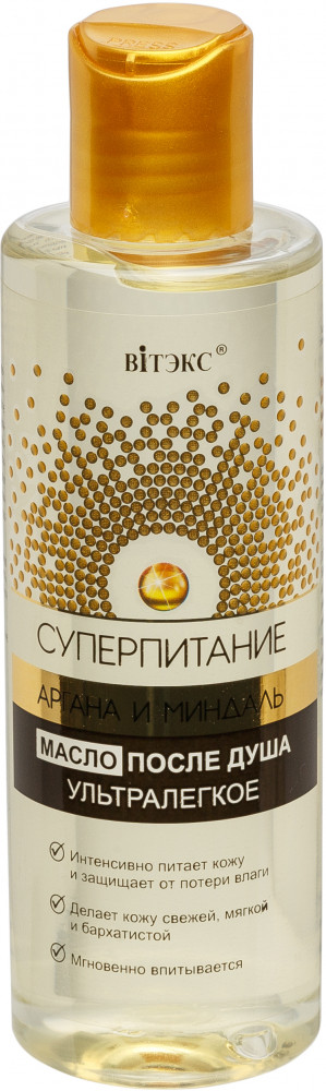 Вiтэкс Масло для тела ультралегкоеВ данный момент этот товар отсутствует в продаже. Возможно, у нас найдется аналогичный или похожий товар здесь. Серия: Суперпитание Ультралегкое масло — это идеальное средство для полноценного ухода за кожей после водных процедур. Масла арганы и сладкого миндаля эффективно питают, увлажняют и смягчают кожу, делают ее нежной, гладкой и шелковистой. Особенно рекомендуется использовать масло после воздействия хлорированной, морской или жесткой воды. Оно мгновенно устраняет сухость и стянутость кожи, восстанавливает естественный уровень увлажненности, предохраняет от раздражений и шелушений. Масло легко впитывается, не оставляя жирной пленки.  |