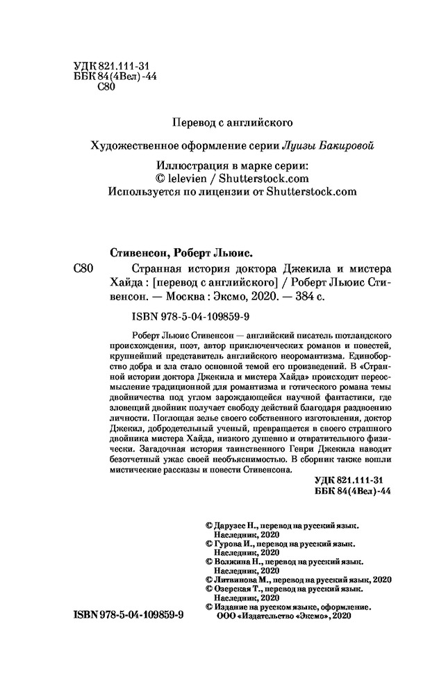 Серия: Белая птица Роберт Льюис Стивенсон — английский писатель шотландского происхождения, поэт, автор приключенческих романов и повестей, крупнейший представитель английского неоромантизма. Единоборство добра и зла стало основной темой его произведений. В «Странной истории доктора Джекила и мистера Хайда» происходит переосмысление традиционной для романтизма и готического романа темы двойничества под углом зарождающейся научной фантастики, где зловещий двойник получает свободу действий благодаря раздвоению личности. Поглощая зелье своего собственного изготовления доктор Джекил, добродетельный ученый, превращается в своего страшного двойника мистера Хайда, низкого душевно и отвратительного физически. Загадочная история таинственного Генри Джекила наводит на безотчетный ужас своей необъяснимостью. В сборник также вошли мистические рассказы и повести Стивенсона. |