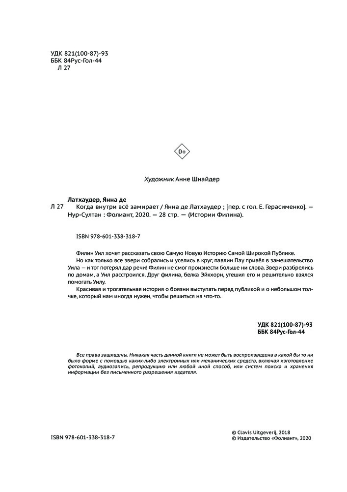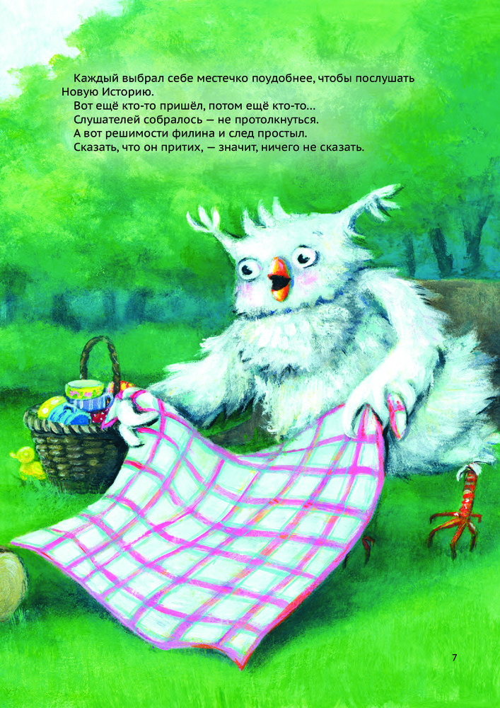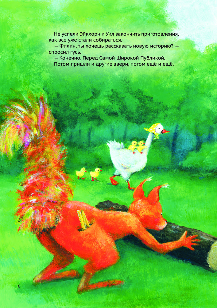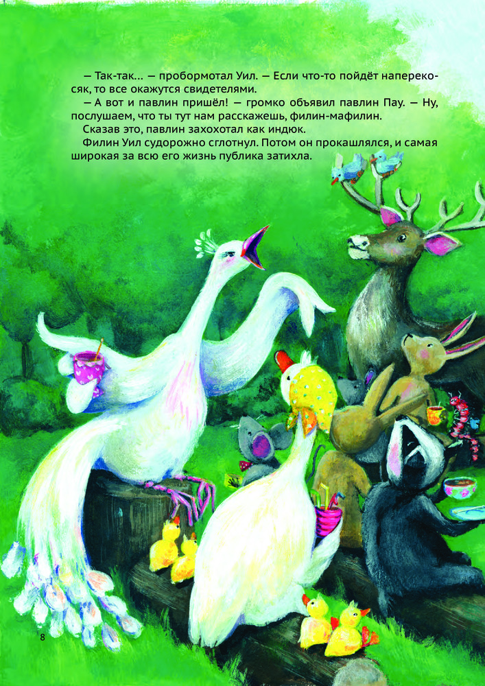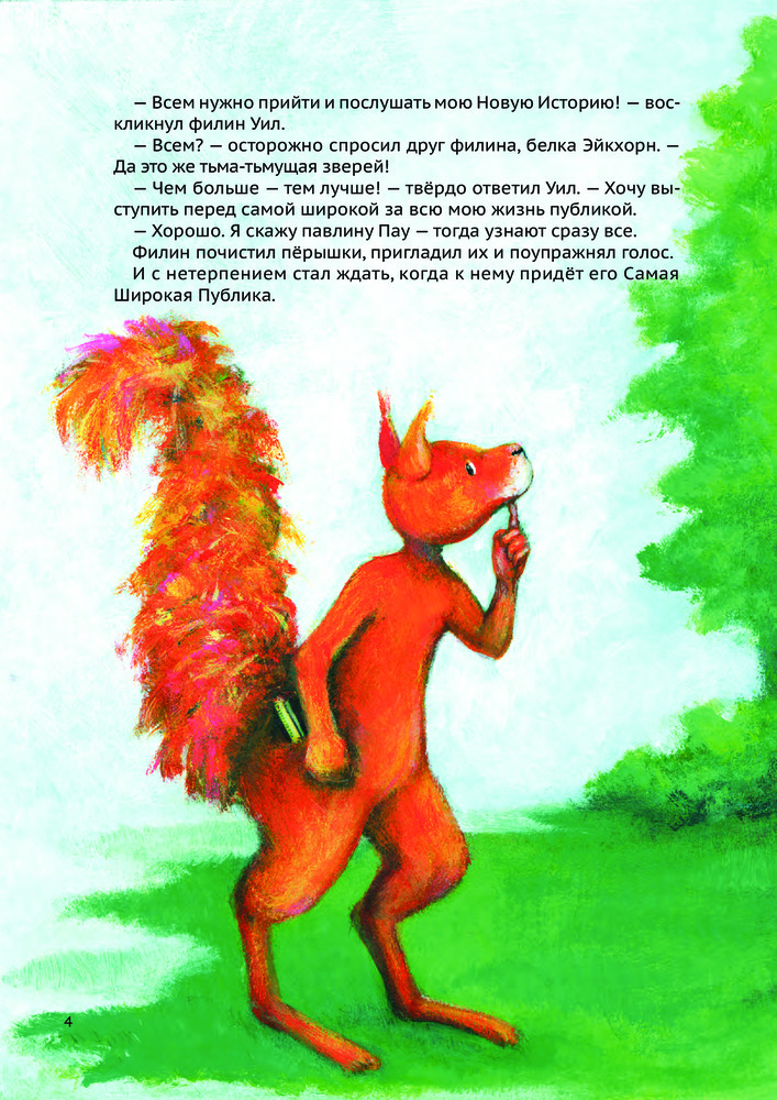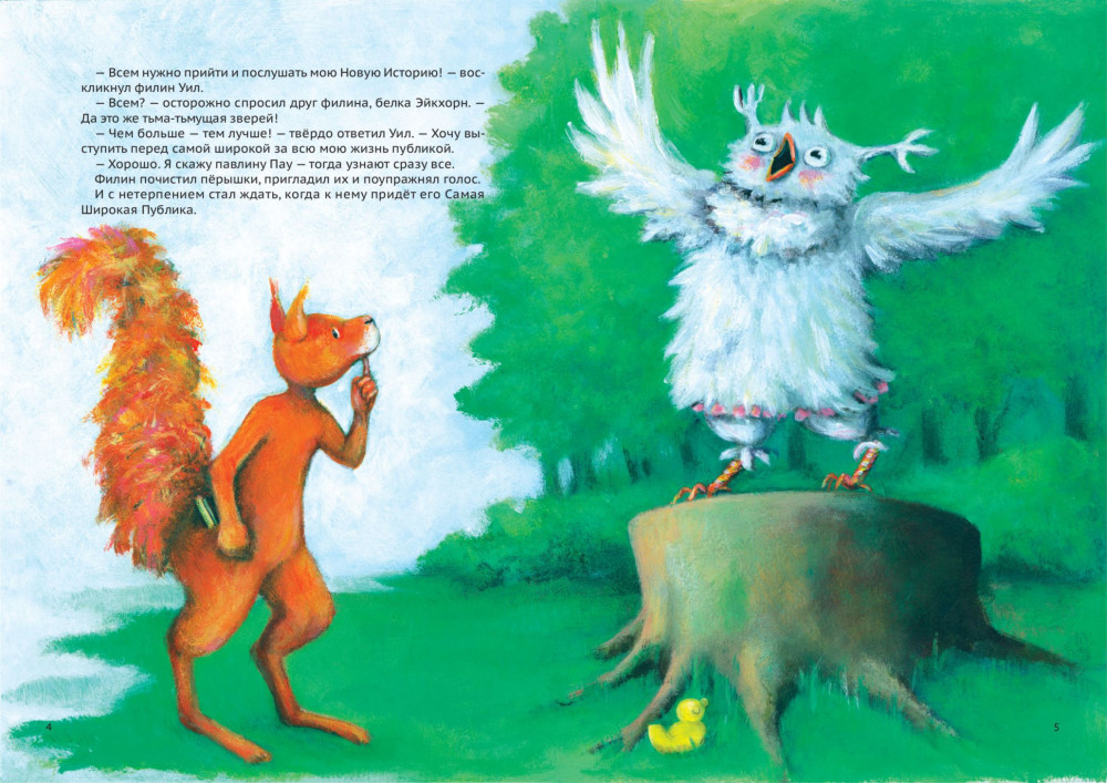 Серия: Истории Филина Филин Уил хочет рассказать свою самую новую историю самой широкой публике. Но как только все звери собрались и уселись в круг, павлин Пау привёл в замешательство Уила — и тот потерял дар речи! Филин не смог произнести больше ни слова. Звери разбрелись по домам, а Уил расстроился. Друг филина, белка Эйкхорн, утешил его и решительно взялся помогать Уилу. Красивая и трогательная история о боязни выступать перед публикой и о небольшом толчке, который нам иногда нужен, чтобы решиться на что-то. |