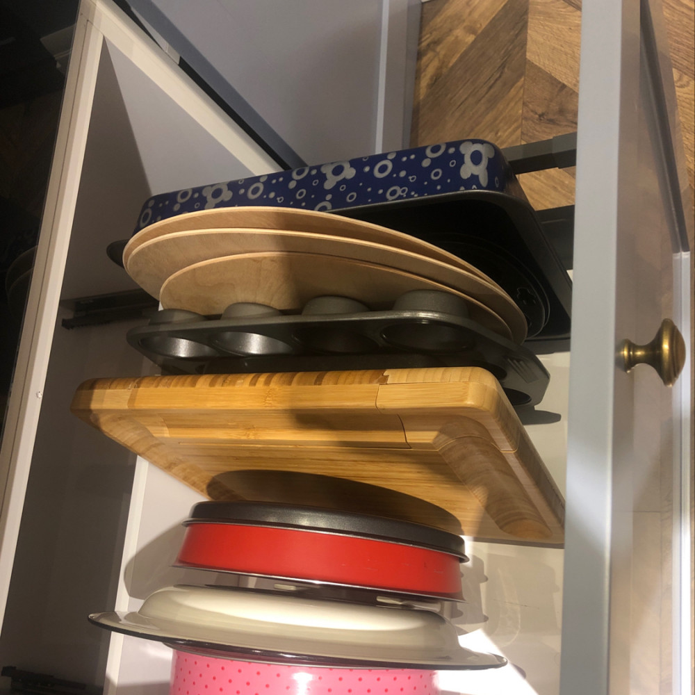 Поставила бы все 10 баллов:))) Очень ждала его и не прогадала. Кто не знает, есть дополнительно к нему «удлинитель полки», если вам нужно больше сковородок или противней уместить)) Качество тоже достойное. Теперь у меня все аккуратно и опрятно)))))))