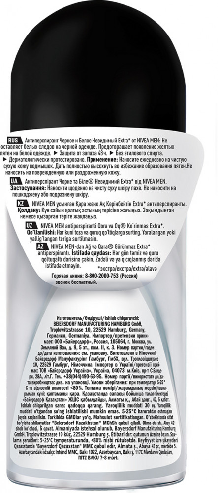 💳 Оплатить за товар можно при получении 🇰🇿 Есть бесплатная доставка по Казахстану 🎁 Копите бонусы с каждой покупки Серия: Невидимый для черного и белого Новый антиперспирант «Nivea Men Extra» защищает не только тебя, но и твою одежду. Продукт обеспечивает 5в1 защиту от запаха, пота, пятен, следов и раздражения. Придает ощущение свежести в течение всего дня. Никаких белых пятен на черной одежде и желтых пятен — на белом. Получи надежную защиту в течение 48 часов без спирта. |