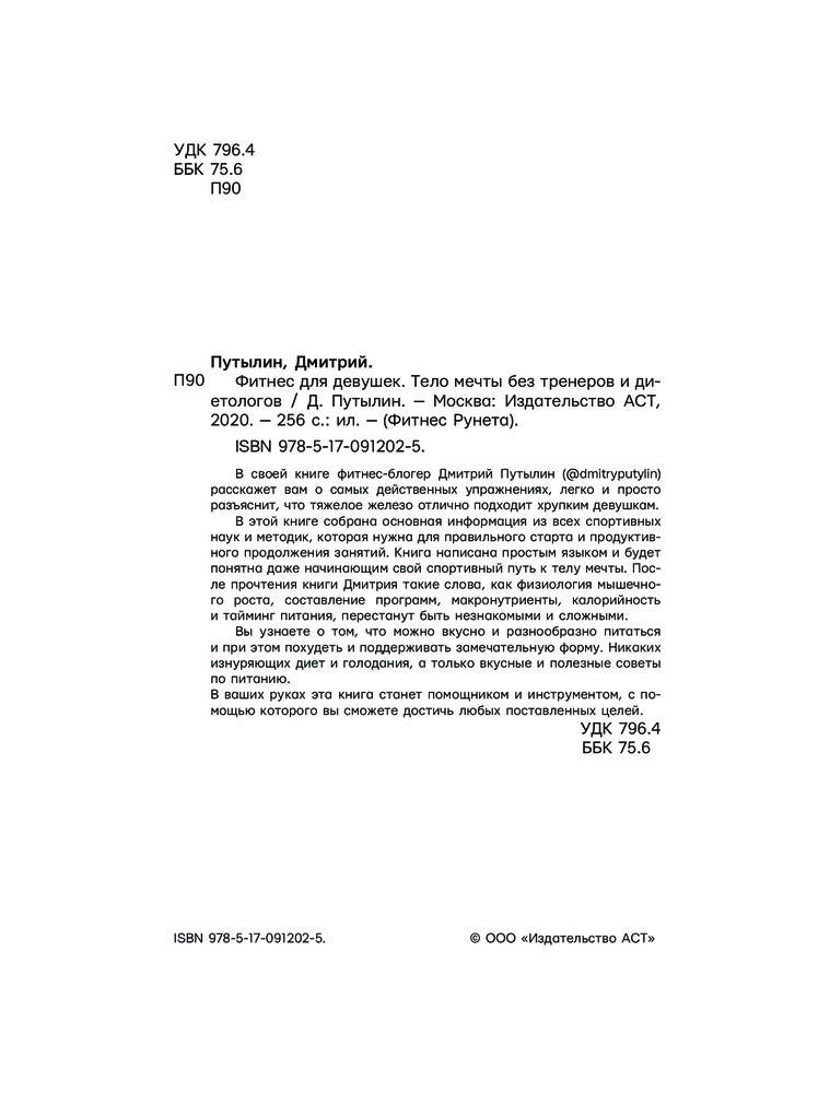 Серия: Фитнес Рунета В своей книге фитнес-блогер Дмитрий Путылин (@dmitryputylin) расскажет вам о самых действенных упражнениях, легко и просто разъяснит, что тяжелое железо отлично подходит хрупким девушкам. |