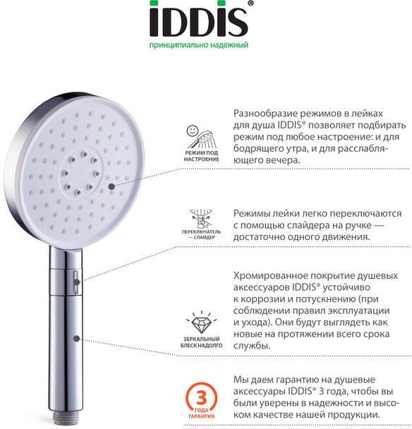 Iddis Лейка для душаВ данный момент этот товар отсутствует в продаже. Возможно, у нас найдется аналогичный или похожий товар здесь. Серия: Swipe Лейка для душа изготовлена из ABS-пластика, высокопрочного и легкого материала, с надежным хромированным покрытием, которое гарантирует идеальный зеркальный блеск и защиту изделия на долгий срок. Зеркально гладкая поверхность — ослепительный блеск и простота в уходе. Известковый налет с поверхности лейки легко удалить одним движением пальца. Режимы лейки легко переключаются с помощью слайдера на ручке — достаточно одного движения. |