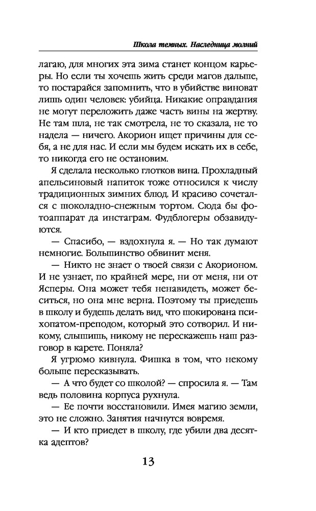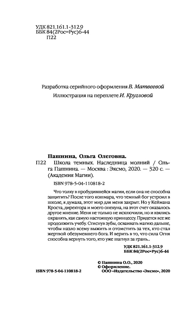 Школа темных. Наследница молнийВ данный момент этот товар отсутствует в продаже. Возможно, у нас найдется аналогичный или похожий товар здесь. Серия: Академия магии Что толку в пробудившейся магии, если она не способна защитить? После того кошмара, что темный бог устроил в школе, я думала, этот мир для меня закрыт. Но у Кеймана Кроста, директора и моего опекуна, на этот счет оказалось другое мнение. Меня не только не исключили, но и взялись охранять, как самую настоящую принцессу. Придется все же продолжить учебу. Стиснув зубы, осваивать магию дальше, чтобы назло всему выжить и отомстить за тех, кто стал жертвой обезумевшего бога. И верить в то, что сила Огня способна вернуть того, кто уже шагнул за грань... |