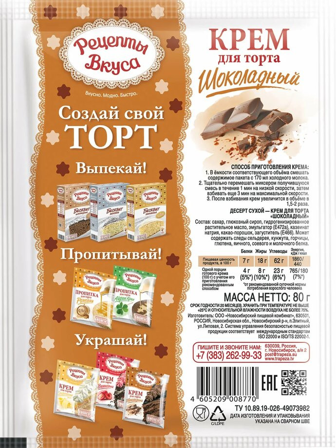 | Каждый продукт из этой серии обладает своими особыми потребительскими свойствами, выгодно отличающими его от конкурентов. Основной секрет готовых смесей для выпечки «Рецепты вкуса» — это создание атмосферы тепла, уюта и радости в Вашем доме! |