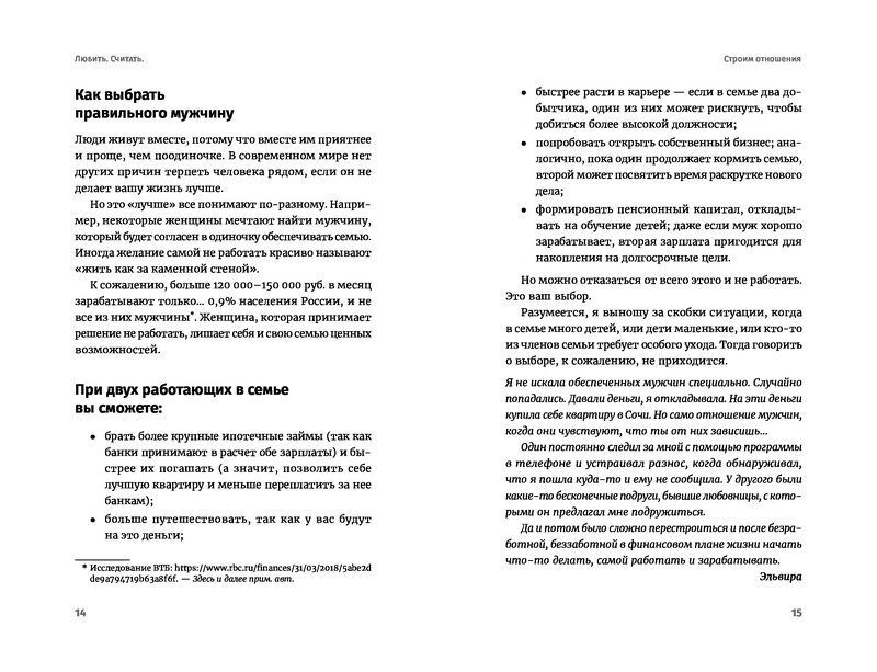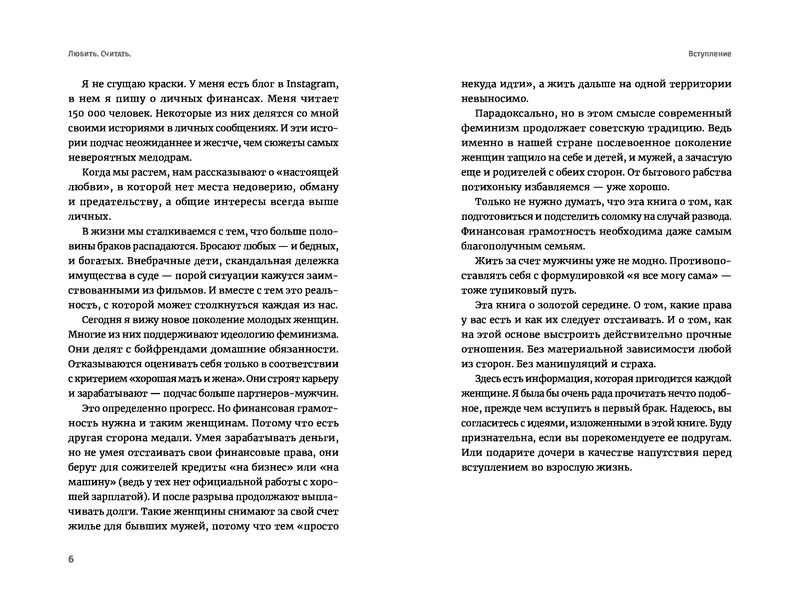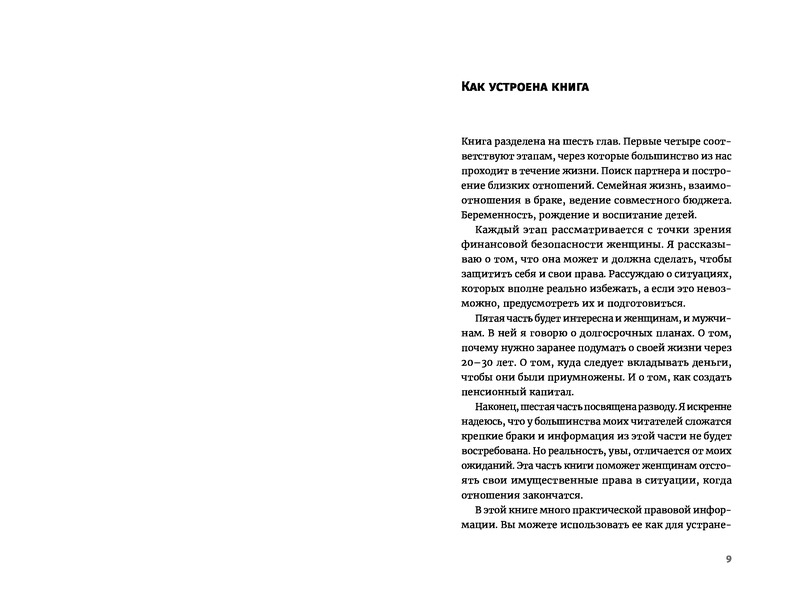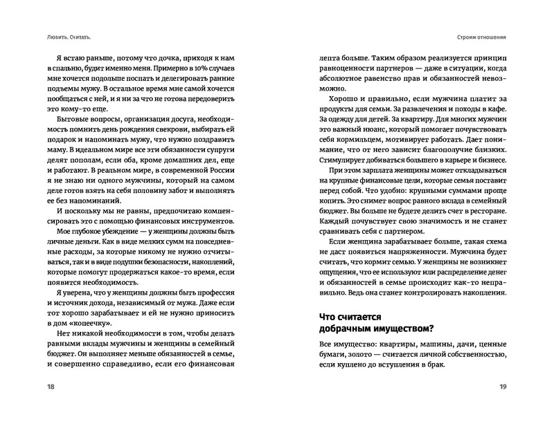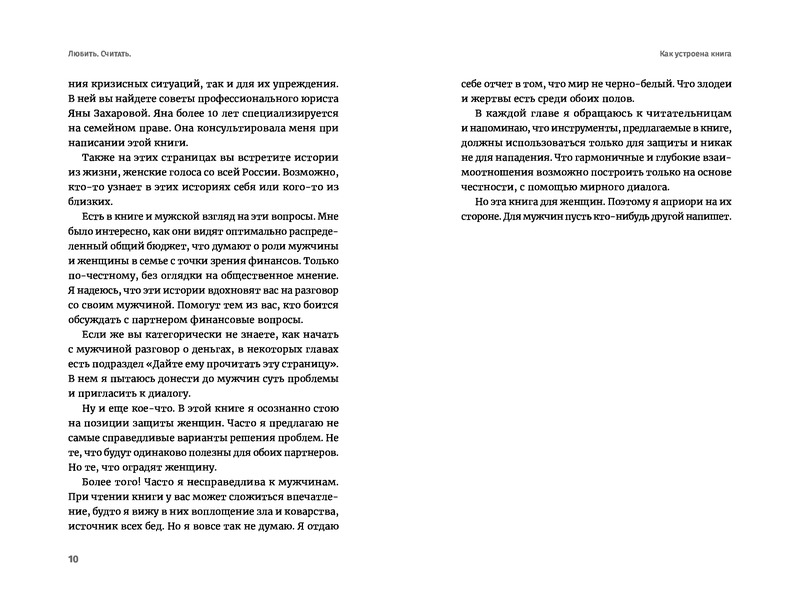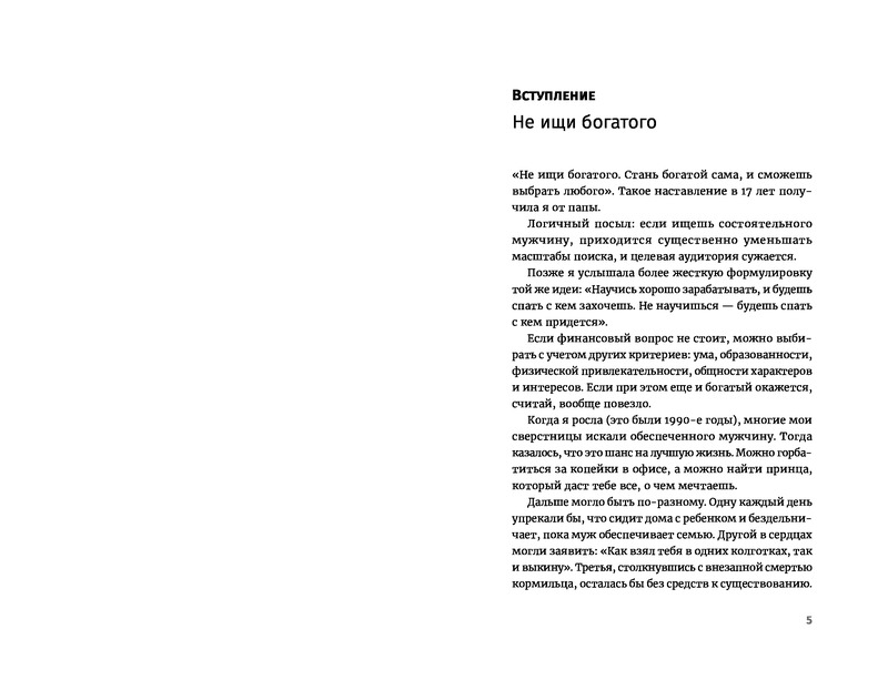 «Книга про фундаментальные отношения с деньгами. Про финансовую независимость женщины, потому что это основа независимости в целом: от родителей, мужчин и обстоятельств. Можно сколько угодно развивать в себе лидерские качества, заниматься саморазвитием, тренировать осознанность, но, если ты вынуждена просить у мужа 500 рублей, чтобы купить колготки, а твоей зарплаты не хватает, чтобы снять квартиру или комнату, ты не можешь по-настоящему контролировать свою жизнь.».