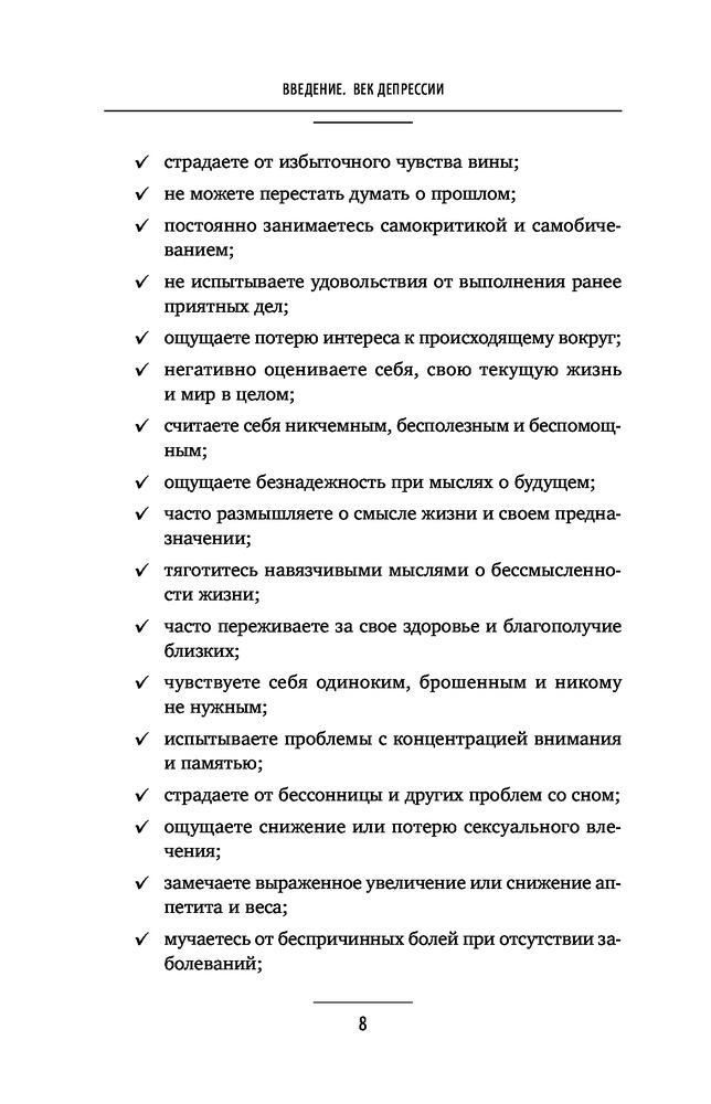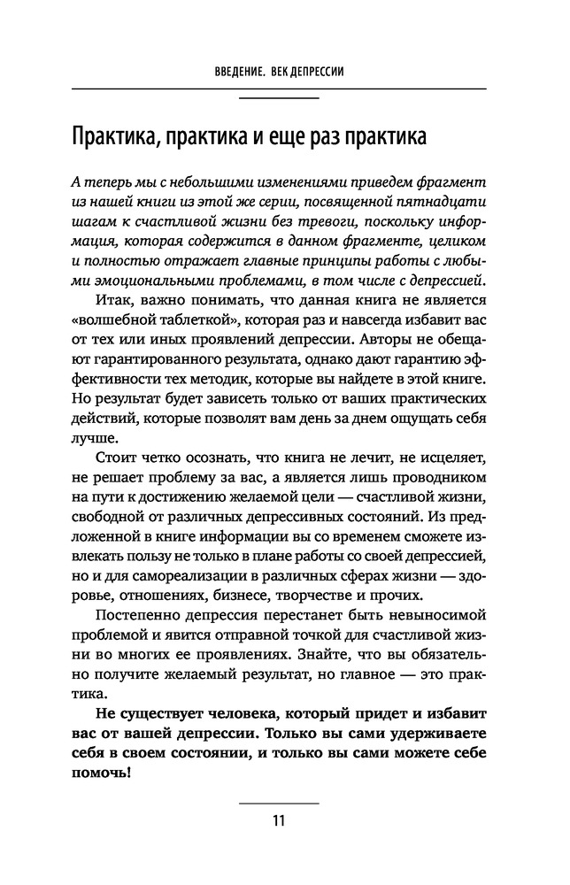Серия: Умный тренинг, меняющий жизнь Страдаете от грусти, тоски и уныния? Чувствуете усталость и слабость? Ощущаете повышенную тревожность и раздражительность? Не можете не думать о прошлом? Считаете себя никчемным неудачником? Мучаетесь от бессонницы и навязчивых состояний? Эта книга — пошаговое руководство по избавлению от депрессии, тревоги, тоски и уныния. Без антидепрессантов, сеансов у психотерапевтов, постоянной самокритики и мыслительной жвачки. Быстро. Просто. Эффективно. Вы получите ключи к отличному настроению и счастливой жизни. |