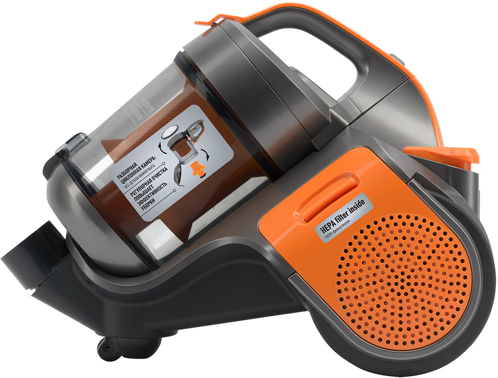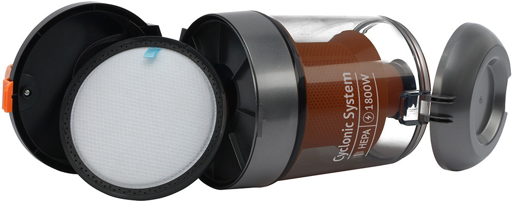 Мощность всасывания — 420 Вт. Этот пылесос отлично справляется со сбором мусора, обеспечивается чистота в помещении после завершения уборки. В виде пылесборника выступает циклонный фильтр с емкостью 2.5 литра. Его можно легко извлечь из пылесоса и очистить от скопившегося мусора.