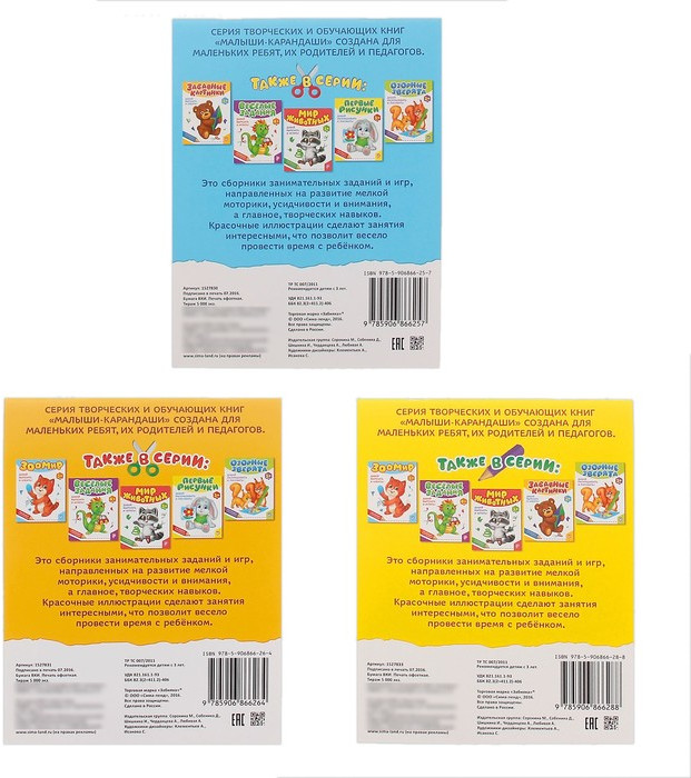 Набор книг для творчества «Малыши- карандаши №2»В данный момент этот товар отсутствует в продаже. Возможно, у нас найдется аналогичный или похожий товар здесь. Серия: Творческие тетради Задумываетесь о том, как привить ребёнку любовь к чтению? Рецепт прост: возьмите издание с красивыми картинками, захватывающей историей и милыми героями. Книги развивающие набор «Малыши-карандаши», 3 шт, по 52 стр. — отличный вариант для тех родителей, которые привыкли окружать своего малыша только лучшими и качественными вещами. За такой книжкой ваш ребёнок проведёт время с пользой и удовольствием, узнает много нового и интересного. |
