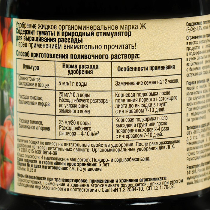 💳 Оплатить за товар можно при получении 🇰🇿 Есть бесплатная доставка по Казахстану 🎁 Копите бонусы с каждой покупки Жидкое комплексное органоминеральное удобрение с гуматами и природным стимулятором специально разработанное для применения при выращивании рассады томатов, баклажанов и перцев. Правильное питание укрепляет иммунную систему и защищает растение от стресса! Только здоровое растение может дать желаемый урожай, ради которого, по сути, мы и выращиваем плодовые культуры. Жидкое органоминеральное удобрение рекомендуется использовать для бережной подкормки молодой рассады с момента появления первого листка до пересадки в открытый грунт. Жидкая форма предотвратит обжигание неокрепших корней. А органическая составляющая активно стимулирует рост и развитие корней, а также способствует защите молодого организма от болезней. |
