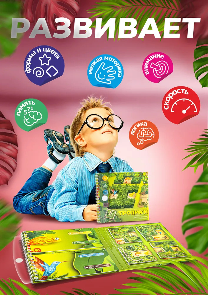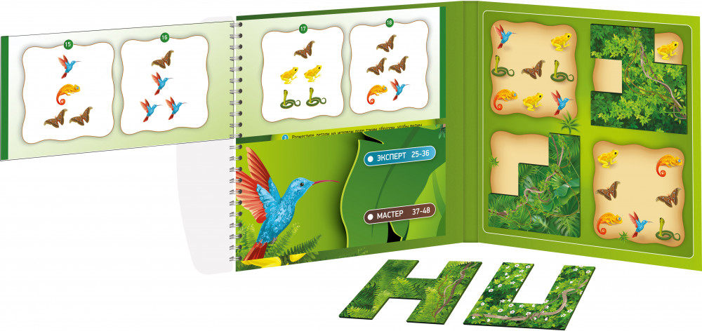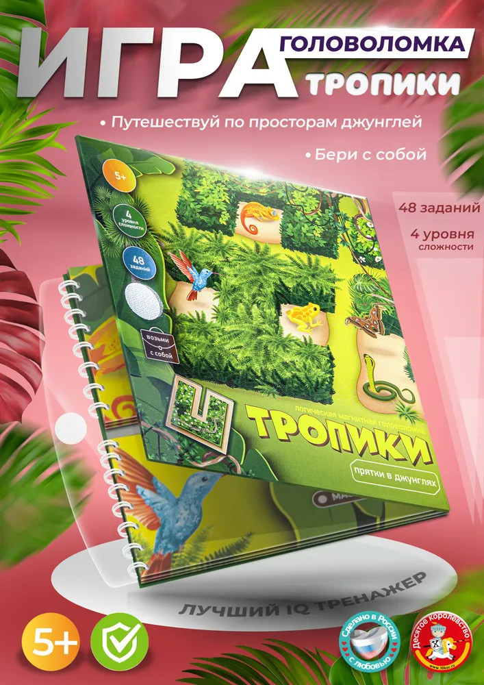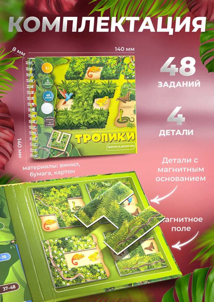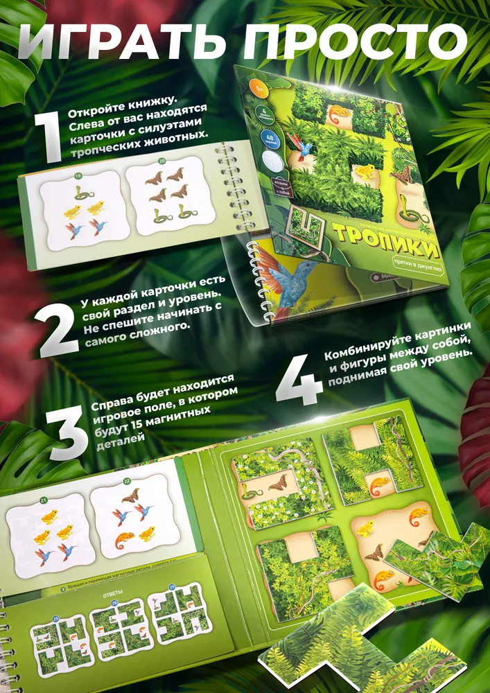 Игра магнитная головоломка «Тропики». Вместе с такой игрой ваш ребенок будет развивать логику, моторику рук, воображение и смекалку. В тропиках обитают яркие колибри, невероятных размеров бабочки, экзотические хамелеоны, змеи и причудливые лягушки.Они скрываются от палящего солнца в тени деревьев и трав. Оставьте на игровом поле только тех обитателей тропиков, которые указаны в задании, а остальных спрячьте за густой зеленью непроходимых джунглей.