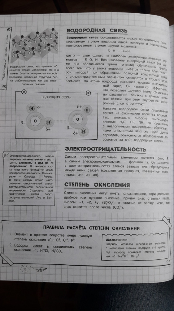 Книга формата А4. Обложка мягкий глянцевый картон, бумага страниц тонковата, хоть и не газетная, но благодаря этому книга легкая. Информации можно было бы побольше, на мой взгляд. Например, что такое электроотрицательность, в ней не указано, только примеры и применение, а вот упоминать три шкалы электроотрицательности по их авторам вообще незачем, разве что только если это нужная информация на ЕГЭ (как написано в аннотации, справочник содержит всё для ЕГЭ)). Но вот для самостоятельного изучения или для повторения взрослому уже не так хорошо подходит. Я, например, забыла уже, что такое электроотрицательность и в книге этого не написано. Что такое окислитель и восстановитель там тоже нет. Хотя вроде бы одни из основных понятий в химии.