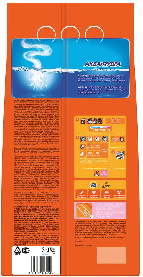 💳 Оплатить за товар можно при получении 🇰🇿 Есть бесплатная доставка по Казахстану 🎁 Копите бонусы с каждой покупки Серия: Color Стиральный порошок «Tide Аромат Lenor Color» Автомат для стиральной машины предназначен для стирки цветного и белого белья. «Tide Аромат Lenor Color» удаляет трудновыводимые пятна и возвращает вещам кристальную чистоту с первой стирки, включая сложные зоны, такие как воротнички, манжеты и область подмышек. Благодаря уникальной технологии Аквапудра, порошок для стирки моментально растворяется при контакте с водой и хорошо выполаскивается. |